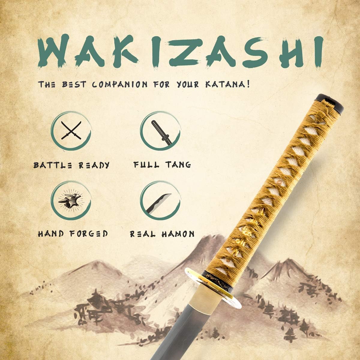 PRODUCT HMS973KWModel: Daisho Combo Set -- Sharpened Katana and Wakizashi Sword Tsuba: Warrior and Fuji TsubaFuchigashira (hilt collar and pommel): Warrior and Fuji Steel: 1045 Carbon Steel Blade: Fully hand forged heat tempered blade without hi (blood groove)Edge: Hand sharpened by Japanese whetstoneHamon (Tempered line): YesTsuka (Handle): Wood handle covered in genuine white ray skin and wrapped in brown cotton ito with menukiTang: Full tang with 2 wood pegs (mekugi); engraved with swordsmith signature Saya (Scabbard): Brown piano lacquered wood with sakura flowers wrapped by brown cotton sageo (cord)The sword can be fully disassembled and reassembledKatana:Blade Length (with Habaki): 28.3"Handle Length: 10.6"Overall Length(with Saya): 40.8” Weight with Saya : 2.8 lbWeight without Saya: 2.3 lbWakizashi:Blade Length (with Habaki): 20.9"Handle Length: 9.4"Overall Length(with Saya): 32.5” Weight with Saya : 2.2 lbWeight without Saya: 1.8 lbPackage Includes:1 * Assembled Katana with saya1 * Assembled Wakizashi with saya2 * Black cotton sword bag2 * Tube cardboard boxPackage weight: 9 lb
