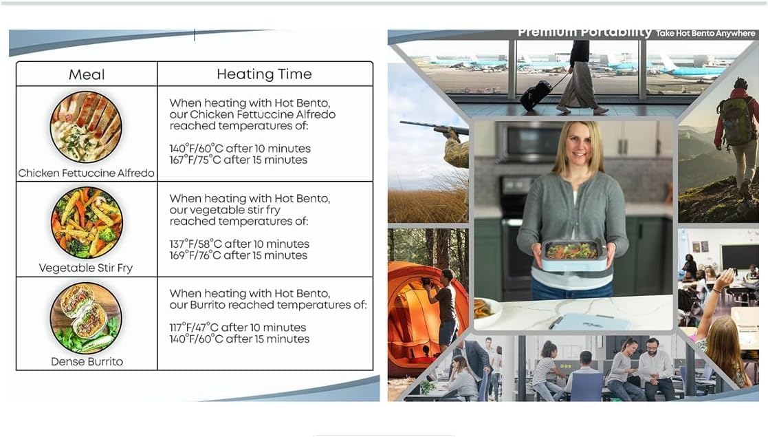 Enjoy the Warmth of a Home-Cooked Meal Anywhere. Take Hot Bento to work, outdoor recreation or travel and enjoy a delicious, heated meal on-the-go. Hot Bento applies recent developments in battery technology to improve the efficiency and speed of meal prep. Our proprietary lithium battery pack is rechargeable, safe and offers unparalleled on-demand convenience. Charge after each use (light on wall charger turns from red to green when fully charged). Do not immerse in water or liquids (not water proof). Wipe nonstick surface with cloth or sponge not steel wool or scrubby. Lid can be washed normally. Comes with a Full Year Limited Waranty.