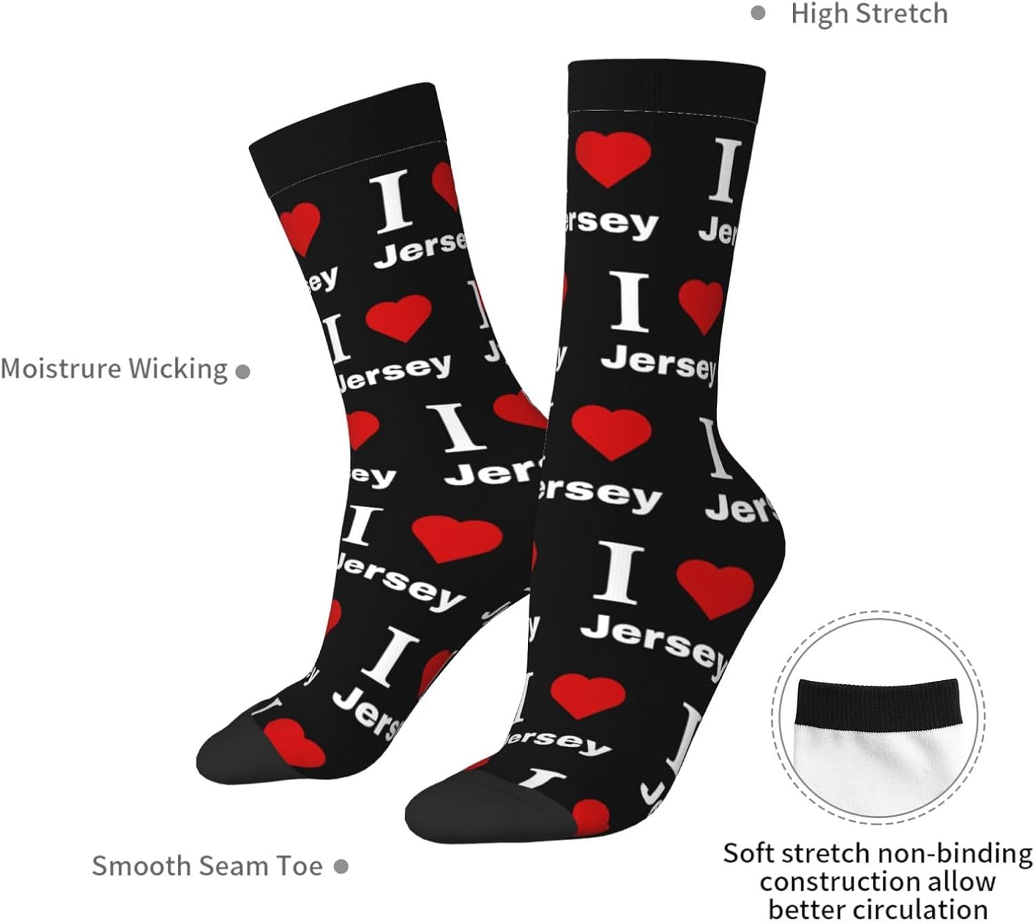 SOCKS FOR ALL SEASONS - Our I love Jersey Socks Come In A Variety Of Styles Designed To Go With Every Outfit. Our Socks Are Made From High Quality Materials That Are Both Comfortable And Stylish. One Size Fits All.DURABLE - Our Athletic Socks Are Comfortable And Breathable For Your Active Lifestyle. These Athletic Socks Are Made Of 97% Polyester And 3% Spandex To Ensure Durability.COMFORTABLE TO WEAR - The Fit Is Designed To Keep You Comfortable Both Indoors And Outdoors. Wear Our Athletic Socks When You Are Relaxing At Home Or When You Are Out And About! With Our Socks, You Can Work Out, Dance And Move Freely In Comfort!MID CALF RUNNING SOCKS - Our Socks Are Moisture-Wicking And Breathable, Keeping You Cool And Dry All Day Long. Not Easy To Pilling. Stretchy And No Compression On Your Feet. Whether You Are Going To Work Or Running, Our Casual Athletic Socks Are Perfect For Any Occasion. Breathable Material Is Suitable For All Seasons, A Comfortable Gift For You And Your Family.CUSTOMER SERVICE - Our Sports Socks Are Uniquely Designed And You Can Wear Them For Work, Running, Hiking, Biking, Fitness, Walking And Everyday Wear. You Can Also Purchase These Sports Socks As Gifts. If You Have Any Questions, Please Feel Free To Contact Us! We Will Reply And Solve Your Problem Within 24 Hours!