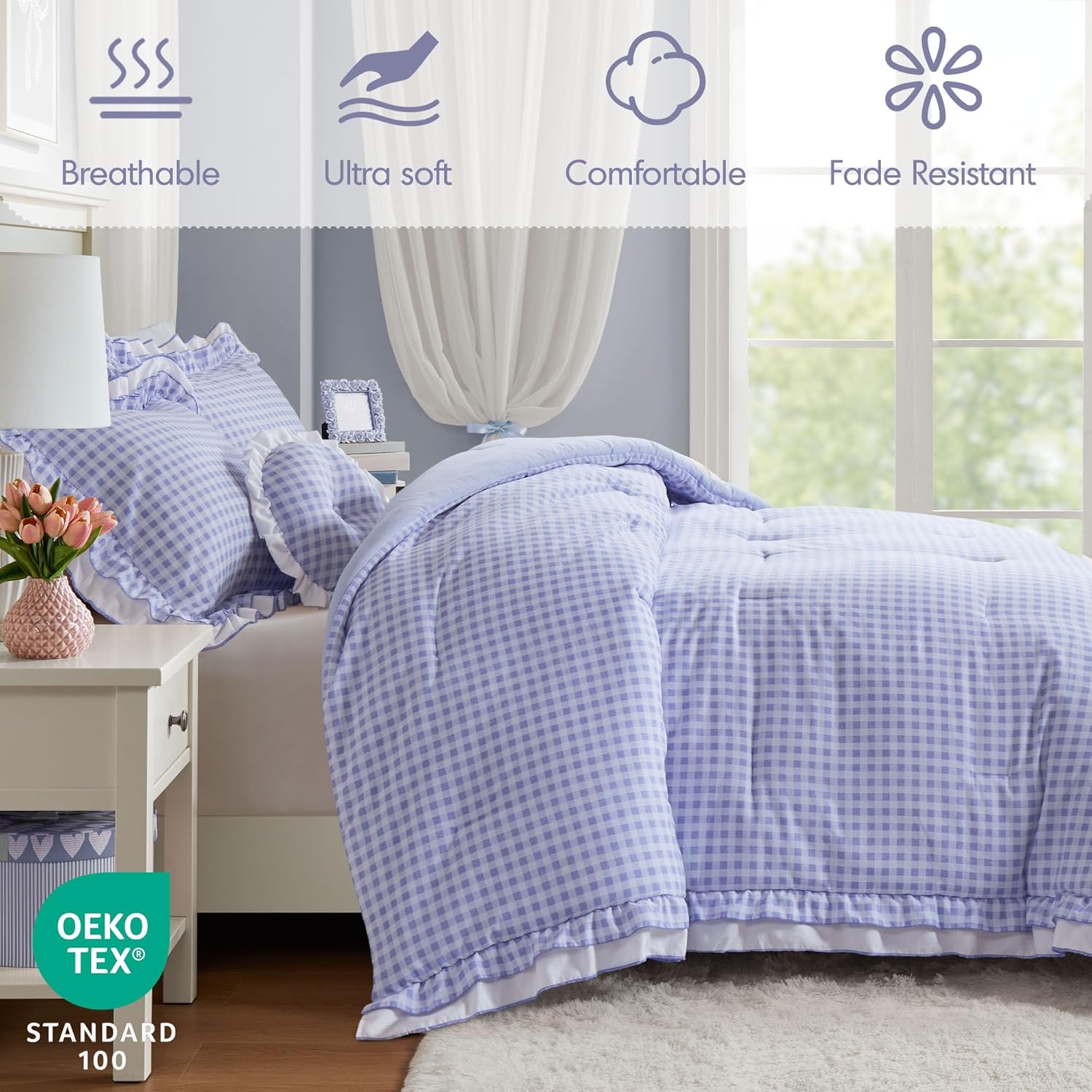 Add a soft romantic touch to your space with this comforter set featuring a dreamy double ruffle edge and sweet gingham details. The matching round ruffle pillow adds a playful accent that completes the look. Made with soft breathable microfiber, it offers lightweight comfort for year round use. Easy to care for and designed to stay smooth and cozy, this set brings a charming and inviting feel to any youth bedroom.