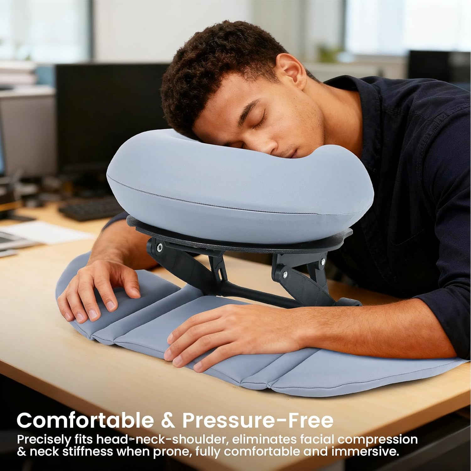 The headrest is filled with soft memory foam and features a cooling fabric cover for enhanced comfort. The memory foam material helps distribute pressure evenly and relax muscles, while the adjustable facial cradle allows customization of tilt angle (0-90°) and height (4-7 inches) to suit individual preferences. Its compact design ensures easy storage without occupying excessive space. This lightweight rest pillow (10.6"×10.6") is foldable and travel-friendly. The height-adjustable base accommodates various desk heights, and the ergonomic arm buffer zone reduces pressure on wrists for prolonged comfort.