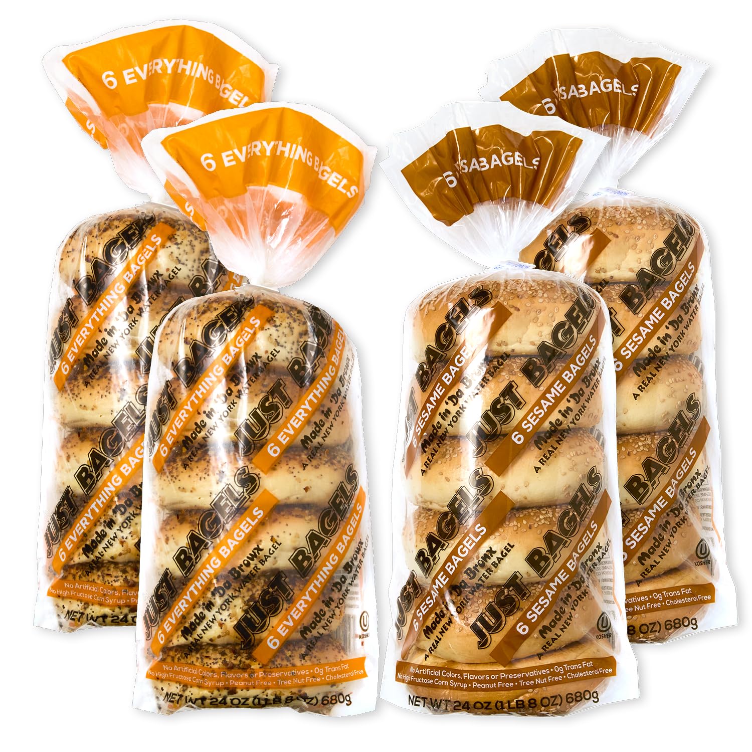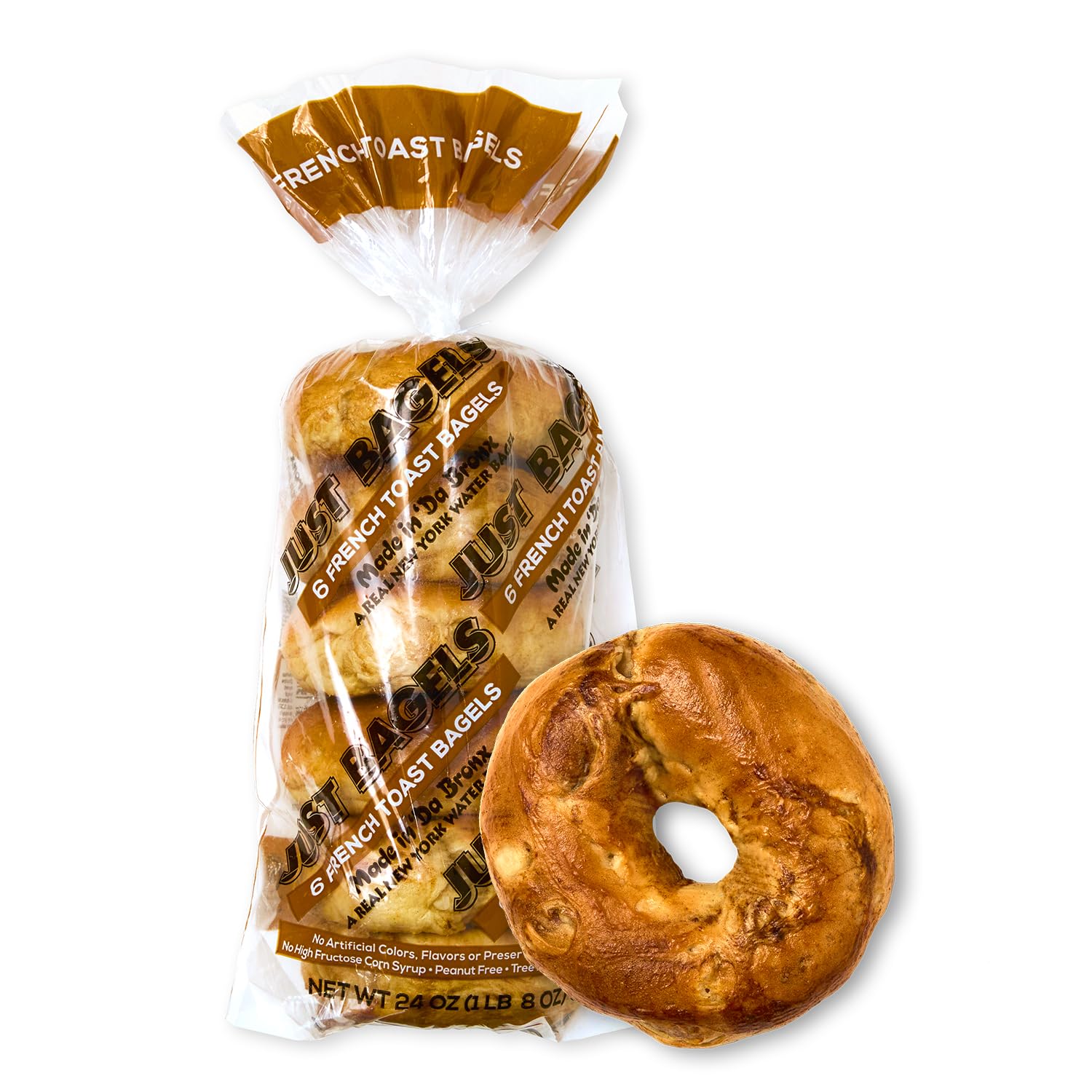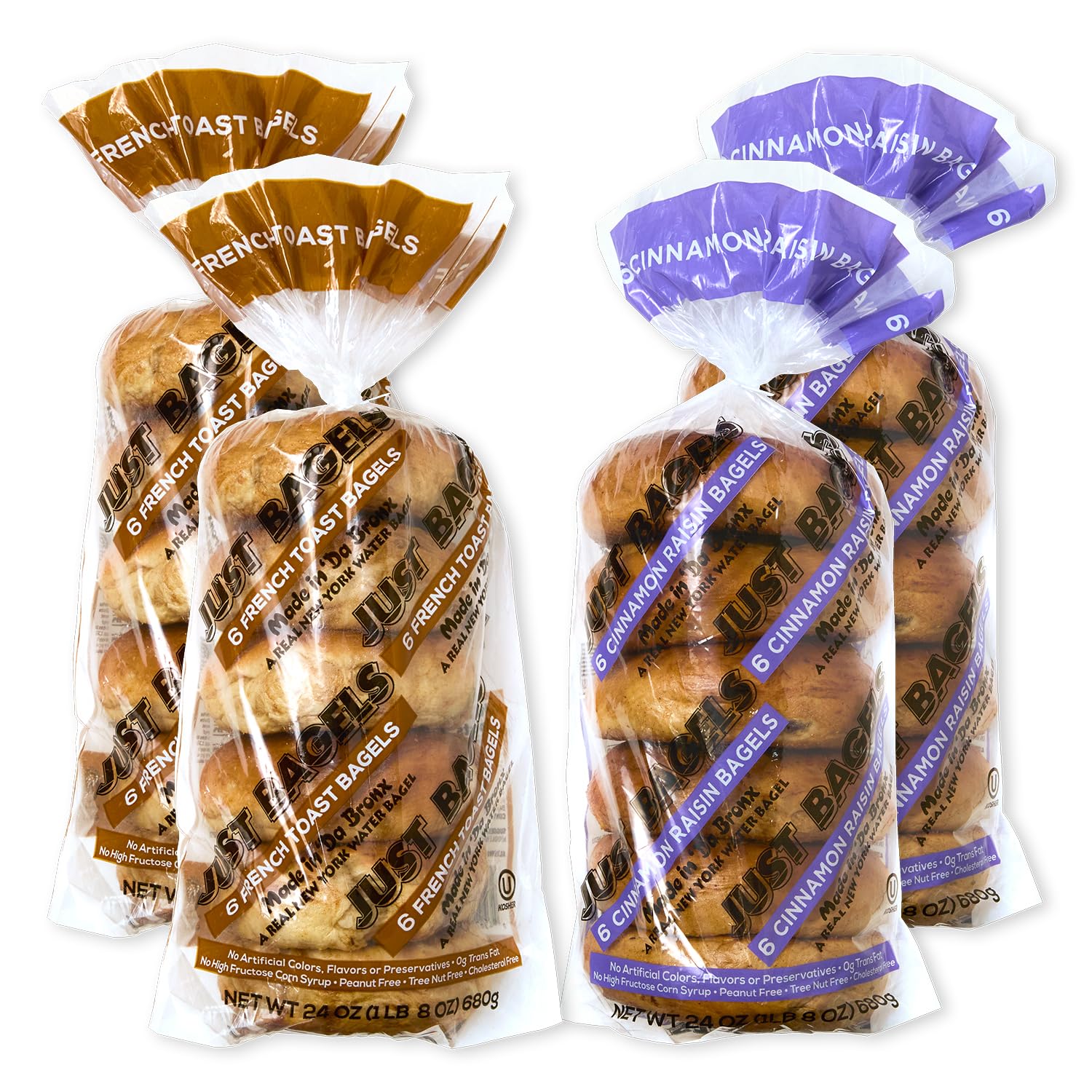 This special bundle includes 2 bags of plain and 2 bags of french toast bagels. The best-tasting bagels are here! Just Bagels has the freshest and tastiest bagels in town. Enjoy eight six packs of our amazing real NYC kettle boiled all natural bagels. Our bagels are all natural, Non GMO, peanut free and Kosher. Must freeze upon arrival as we do not use preservatives. STORAGE INSTRUCTIONS We recommend FREEZING IMMEDIATELY upon delivery to maintain product’s freshness. Can last in freezer for up to 1 year. Can last outside of freezer for 3-4 days outside of direct sunlight and in moderate temperatures. EATING INSTRUCTIONS We strongly recommend either baking or toasting our bagels to get the full benefit of the unique New York crust! THAWING: Allow bagels to thaw at room temperature for 30 minutes. IN A HURRY? MICROWAVE: Wrap frozen bagel in paper towel. Place in microwave for 20-25 seconds before baking or toasting. BAKE: Preheat oven to 425-450 degrees Fahrenheit. Bake 5-7 minutes depending upon oven. Allow to cool before eating. TOAST: Slice bagel and toast 3-4 minutes. Allow to cool before eating."