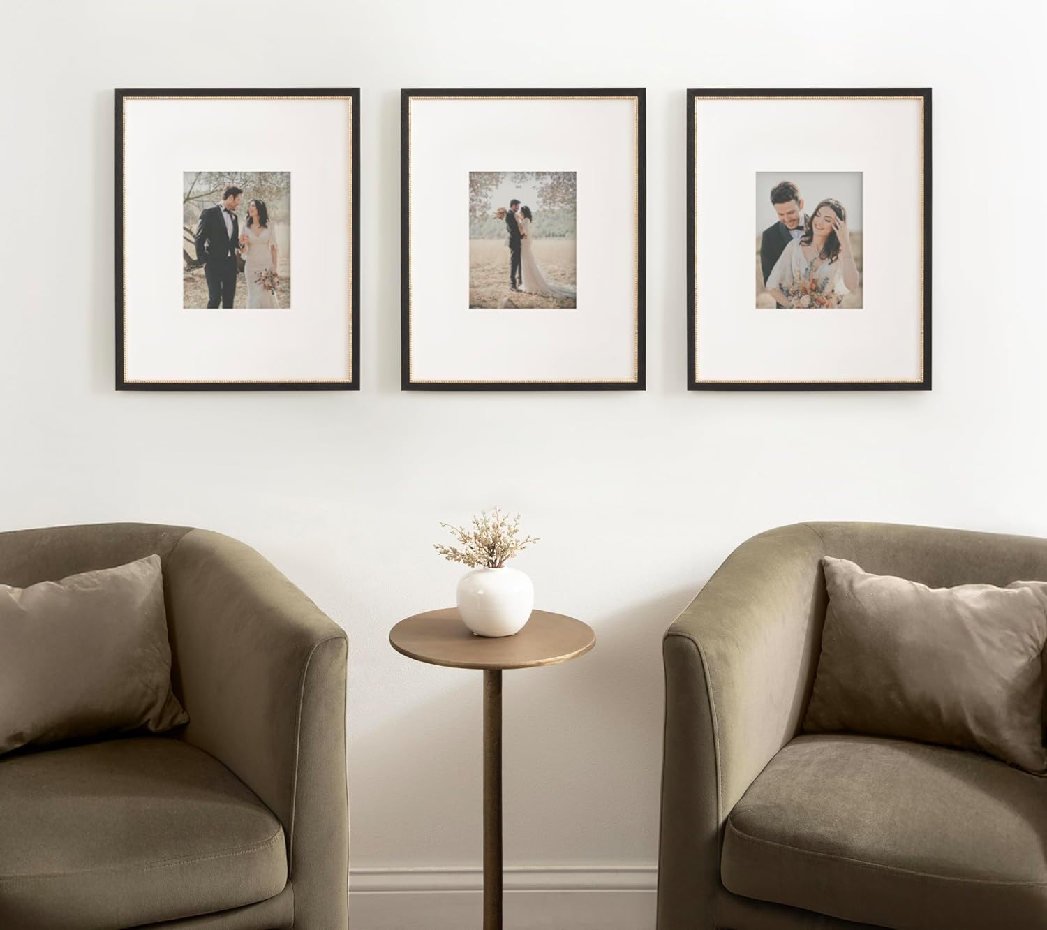 Enjoy the latest addition to our wall frame collections with the Wilbanks picture frame set. Family photographs should be displayed where they can be a constant reminder that time spent with family and friends should be remembered and enjoyed by everyone. This three-piece set fills your space with a cohesive, refined look. Each frame features a black outer frame edge with an inlaid beaded gold border for added refinement and texture. With three separate frames, you can showcase them together for a statement look or throughout your home for a sprawling connective look. The Kate and Laurel Wilbanks picture frame set helps you tell your story creatively, tastefully and with the theme you have in mind. These black, refined frame profiles create a classic look and feel that accentuates your favorite photographs. Each frame fits an 8x10 inch photo with the included white mat or a 16x20 inch photo without the mat. The outside dimensions of each frame are 17.75 inches by 21.75 inches.