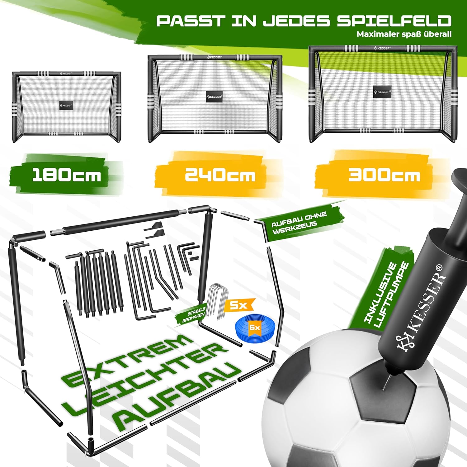 KESSER Football Goal - Includes Goal and Mounting Accessories Experience maximum fun and safety with the KESSER football goal. Product features: Robust and weather-resistant: can withstand all weather conditions, durable and UV-resistant, tear-resistant. Stable and secure hold: the robust steel frame offers a high load capacity and ensures a secure stand. Non-slip hooks provide extra stability. ACCESSORIES INCLUDED - Includes a door wall (optional), sturdy floor hooks, an air pump, a hut and mounting hardware, so you have everything you need for quick and easy installation. Wide selection: Available in three sizes (180 cm, 240 cm, 300 cm) and with or without door, in anthracite, black and blue. Technical details: 180 cm: size football goal L/W/H: 180 x 60 x 120 cm - 6 x coats + air pump. 240 cm: football goal size L/W/H: 240 x 85 x 160 cm - 6 x coats + air pump. 300 cm: football goal size L/W/H: 300 x 120 x 200 cm - 6 x coats + air pump. Material: steel frame, foam, mesh Load capacity: high load capacity. Maintenance: weatherproof and UV-resistant. Contents: 1 x KESSER football goal with mesh and foam cover. 1 x port (optional) 1 x Air Pump 6 x Cottages 1 x mounting accessories. 1 x user manual (English language not guaranteed). Enjoy the fun and safety of the KESSER football goal perfect for any occasion!