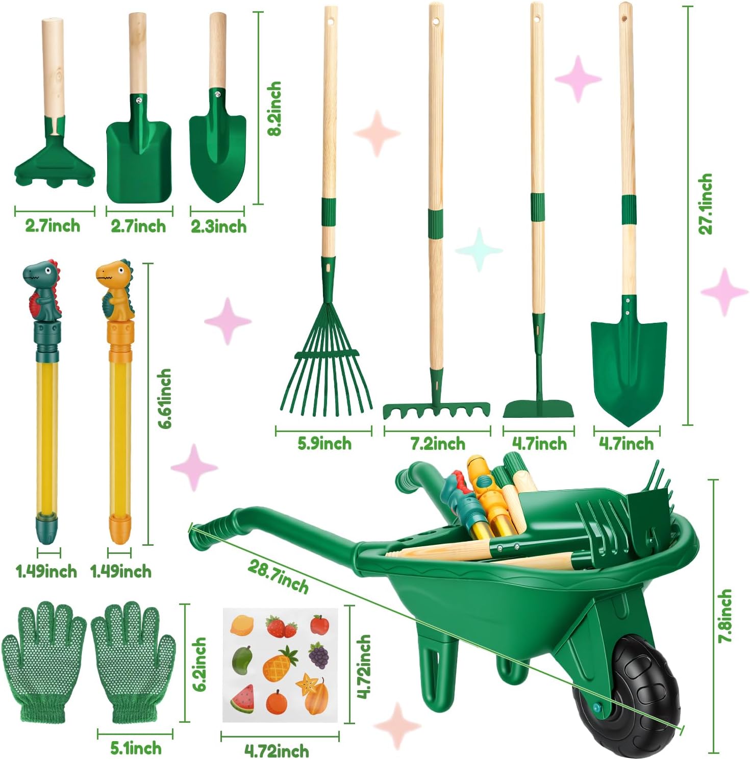 | Included Components | 3 Small Handle Wooden Tools (2 Shovels, Rake), 8 Fruit & Vegetable Stickers, Kids Gloves, water gun, 4 Long Handle Wooden Gardening Tools (Shovel, Rake, Hoe, Leaf Rake), Wheelbarrow |