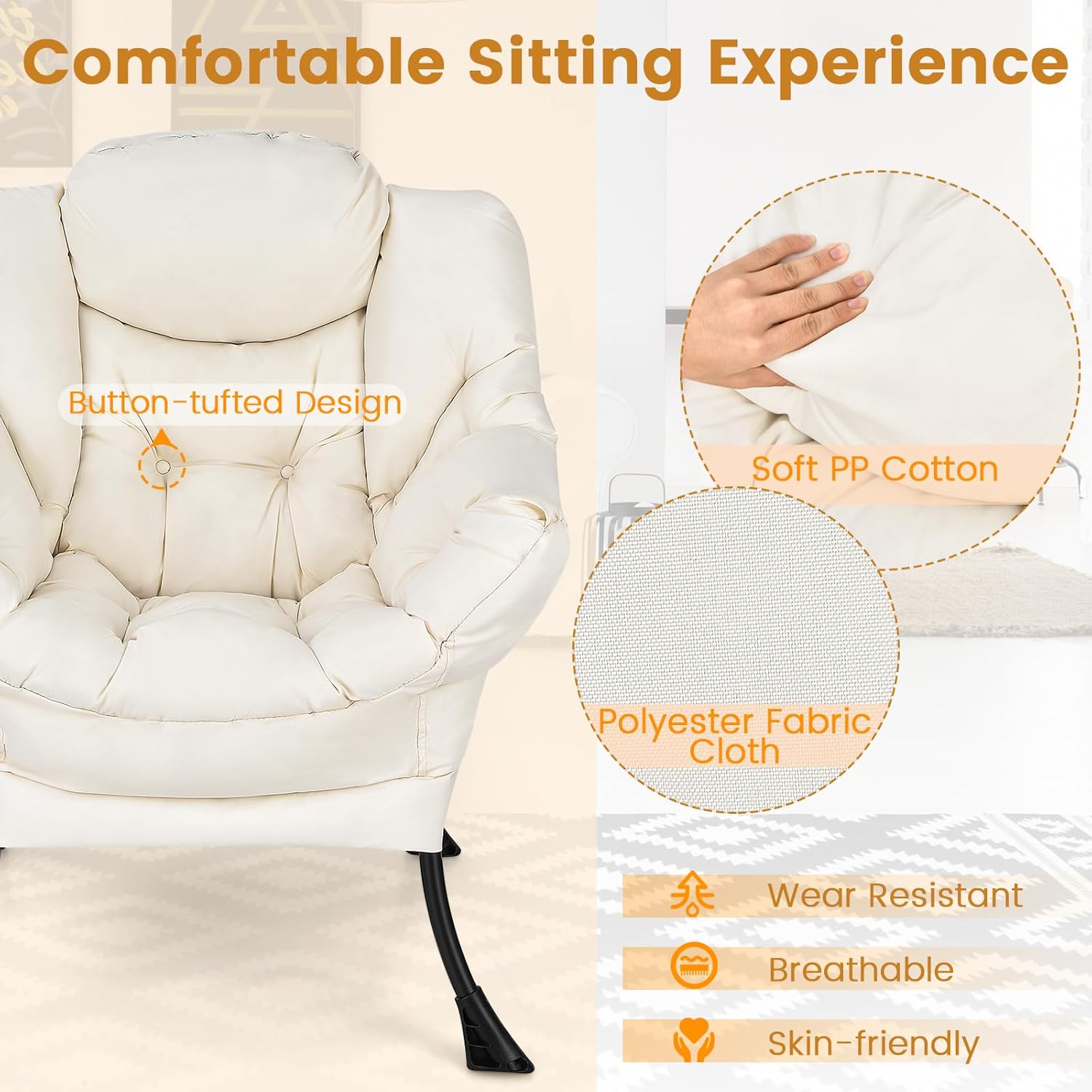 This stylish-looking single sofa is particularly suitable for placing in the living room, bedroom, balcony and other places. This lazy chair is made of high-density PP cotton and polyester fabric, and the cushions are soft and comfortable. There is also a pocket on the side of the armrest, which is convenient for you to place your cell phone and remote control. Our single sofa is made of a steel frame as a structure that can withstand 330 pounds of weight and will not rock or collapse easily. The bottom has plastic foot pads to protect the floor from scratches. In addition, this accent chair can perfectly fit the curve of your body, and can provide enough support for your neck, back, waist and hips. Best of all, this sofa chair is easy to assemble and the cover can be removed for machine washing. This is an ideal accent chair for you.