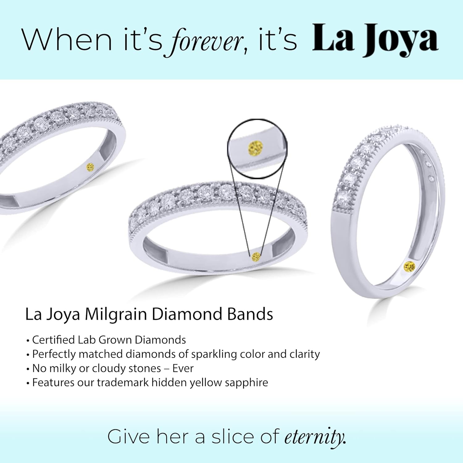 Q: Do your diamond bands come with a certificate of autheticity? A: Yes, every La Joya diamond wedding band is accompanied by a Certificate of Authenticity. The certificate details your diamonds and can be verified online. Q: What is the setting style of the diamonds in these bands? A: The lab-grown diamonds in these bands are meticulously pavé set with a GH color grade and VS/SI clarity. This provides continuous sparkle and enhances brilliance for a smooth, elegant finish. Q: Does the band have any engravings? A: Your diamond wedding ring has a sleek, unadorned design without pre-set engravings, offering a clean, classic look or a perfect canvas for personalized engraving by your local jeweler. Q: Are these bands adjustable? A: Your lab-created diamond bands are not adjustable but can be professionally resized, typically up or down by one full size, by a skilled local jeweler whom we recommend consulting. Q: Does the ring come in a gift box? A: Your lab made diamond ring arrives elegantly housed in a premium, velvet pouch, ensuring a luxurious unboxing experience and safe keeping. Q: Are these bands hypoallergenic? A: While our diamond bands are not specifically certified as "hypoallergenic," they are crafted using a high-quality, nickel-safe alloy, thereby minimizing the risk of allergic reactions for most individuals. Q: What is the width of these bands? A: The diamond bands are approximately 1.50mm in width where the diamonds are pavé set. Due to artisanal craftsmanship, there may be a very slight, negligible variation in this dimension. Q: Is the ring stackable with other bands? A: Absolutely! Your diamond bands are perfectly suited for effortless stacking. The elegant design allows for a unique, personalized stack with various rings and bands. Q: Can the ring be worn daily? A: Yes, your lab-grown diamond band is crafted for everyday elegance and durability. However We recommend you handle your ring carefully so it remains beautiful for years to come.