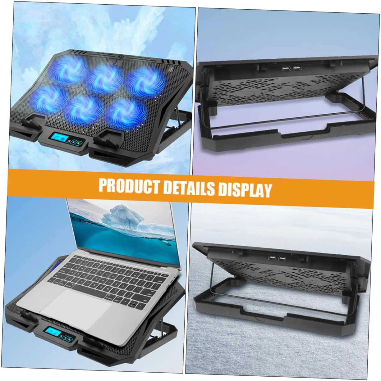 Package List 1 x Laptop Stand Features - Application: Support up to 15.6-inch laptops fan for laptop cooling. -Voltage:5V cooling pad -Fan speed: 2200±10% laptop cooling mat -Size:35.50X25.80X13.80cm/13.95X10.14X5.42in -Product Info:Laptop cooling base -Color:Black -Power:2.1W laptop fans cooling pad -Power supply: USB laptop cooling fan pad. -Current: 0. cooling pads -Material:ABS - : 35-70CFM cooling mat -Easy to take, the laptop holder is not only for indoor use, but also good for travel and business trips laptop stand for cooling. -Made from sturdy materials, this stand for laptop is stable, suitable for use on a desktop or in bed. -Designed to provide a noise-free environment, this laptop stand offers excellent cooling performance cooling fan for laptop. -The adjustable height feature allows you to adjust the laptop stand to your preferred height laptop riser. -Equipped with a USB port, this laptop cooling pad is convenient and easy to use, can be reused for long term cooling stands.Goods Descriptioncooling stand Crafted from sturdy material, this laptop air cooler stand is built to last.laptop cooling stand Its high durability let this laptop stand won't deform or break easily.cooling laptop pad The quiet fans create a noise-free environment, allows you to position your laptop at the table, let you own satisfying using experience