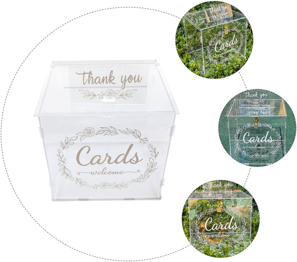 Package List 1 x Acrylic Wedding Card Box Features -Product Info:Wedding card box -Color:Transparent -Material:Acrylic -Size:25.50X25.00X21.00cm/10.02X9.82X8.25in - As a beautiful home decoration, is obviously also a good choice, adding a beautiful scenery card boxes - The excellent workmanship of our acrylic card box will bring you a wedding card money holder. - The attractive and decorative style designed card box can help add an active atmosphere wedding money boxes. - Acrylic box is also ideal for card holder on a reception table for wedding or birthday party card collection wedding money container. - Ideal for centerpiece, for displaying your / thanks cards, keepsake, envelops, congratulation cards, cash , money. card container for weddingGoods Informationwedding money boxes This wedding card box is designed for storing and securing cards or envelopes for wedding party without having someone to monitor table.wedding money holder With understated and elegant design, enough attention to let guests notice it, but not too much to overpower the home decor