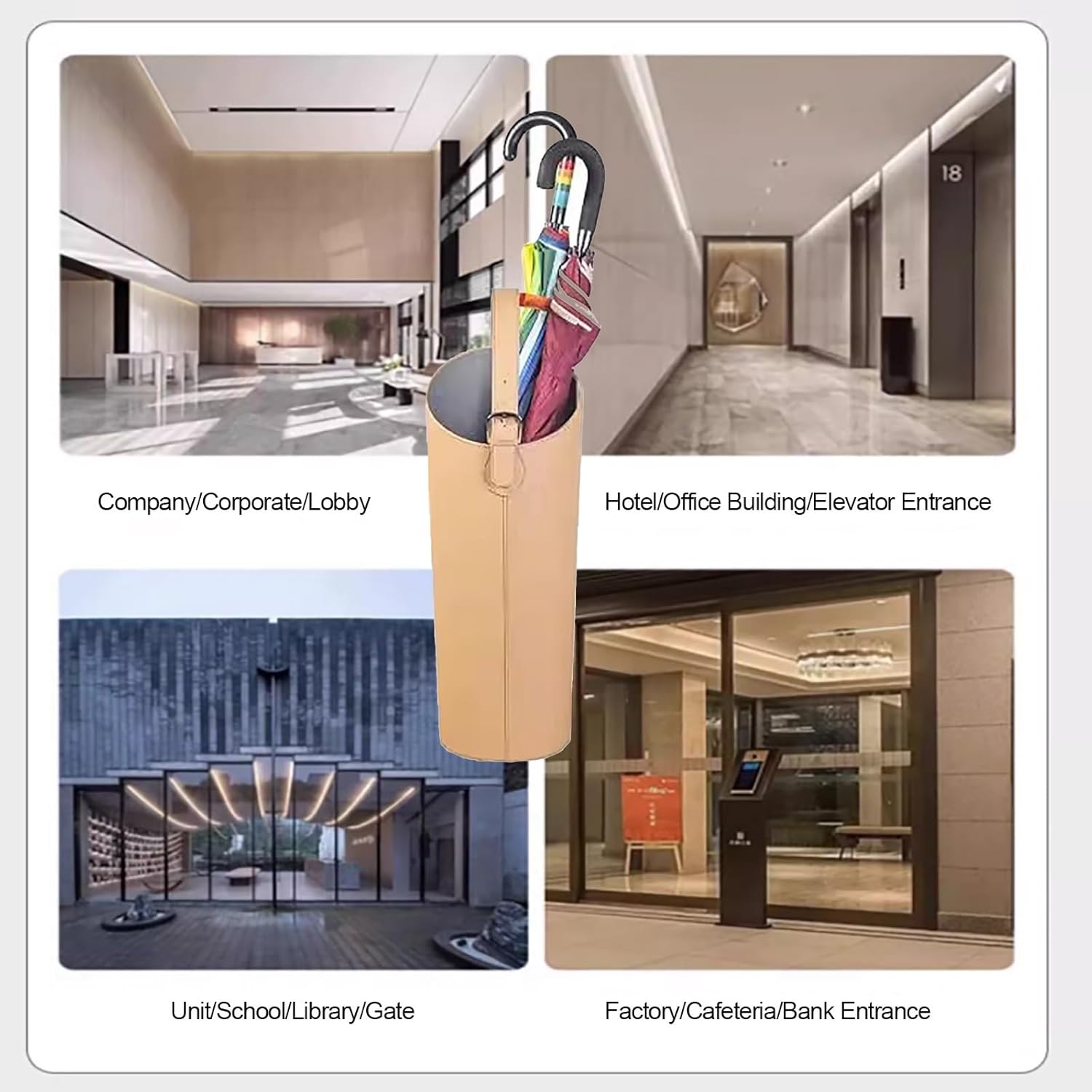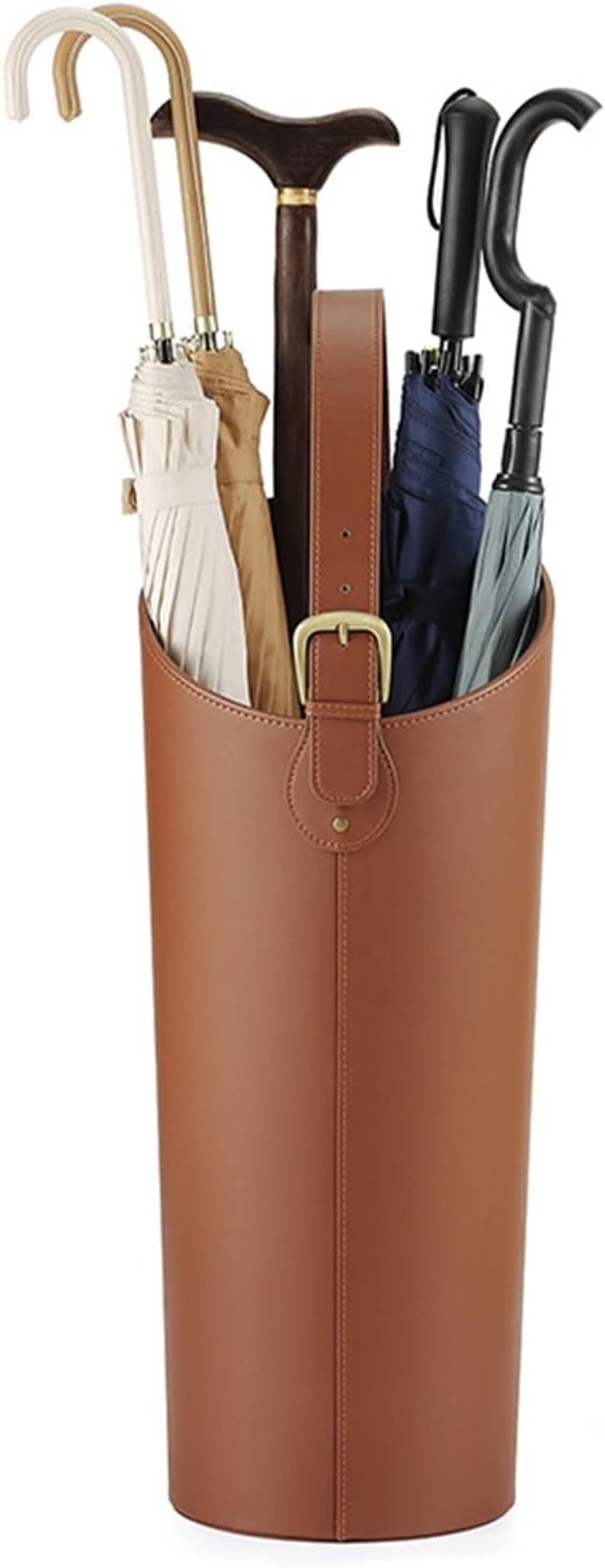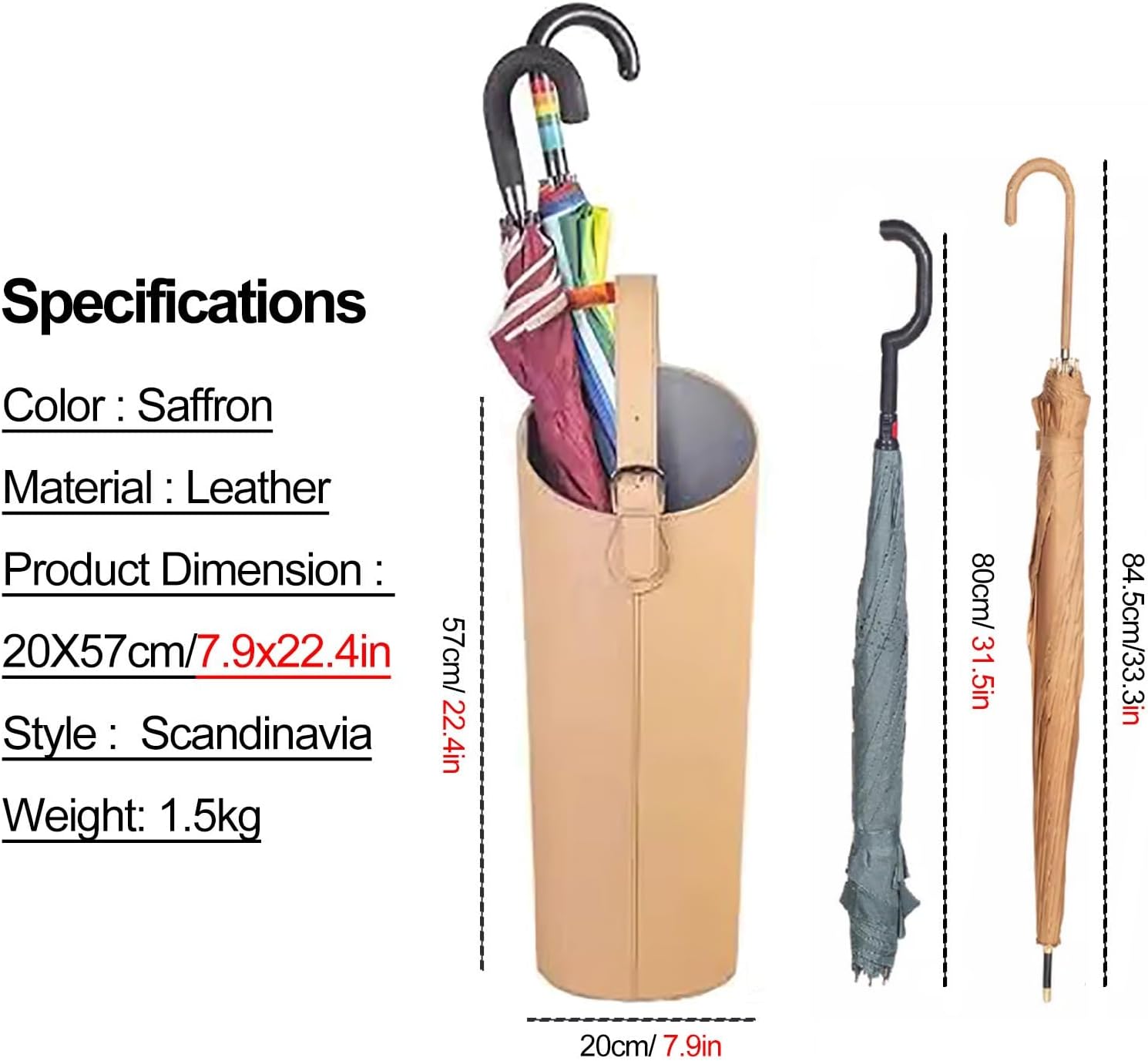 After a stroll in the rain, step inside and effortlessly place your umbrella in this stylish umbrella holder designed to keep your home tidy. By incorporating a functional drip tray, this holder ensures that any excess water is contained, protecting your floors from unwanted wetness. The drip tray is easily removable, making cleaning a breeze. No more cluttered corners or scattered umbrellas; this nizer allows you to neatly store your umbrellas, so you're always prepared for the next rainy day. Its sleek Scandinavian design adds a touch of elegance to your entryway, seamlessly blending with your home decor. **Specifications:** - Color Options: Black, Orange, Brown, Beige, Khaki, Saffron - Material: Leather - Dimensions: 20 x 57 cm (7.9 x 22.4 in) - Weight: 3.3 lbs (1.5 kg) - Style: Scandinavian **Easy to Maintain:** For everyday care, simply wipe the surface with a soft cloth or sponge. Avoid using harsh chemicals and keep sharp objects away to maintain its pristine appearance. **Package Includes:** - 1 Umbrella Holder (umbrellas not included) - 1 Drip Tray - 2 Hooks for added convenience **Note:** Please allow for slight size variations due to manual measurement. While we strive to depict accurate colors, lighting conditions and screen settings may result in minor differences between the product and images. Your understanding is appreciated as we ensure the best quality for you. Elevate your home nization with this umbrella holder, combining practicality with a chic aesthetic.
