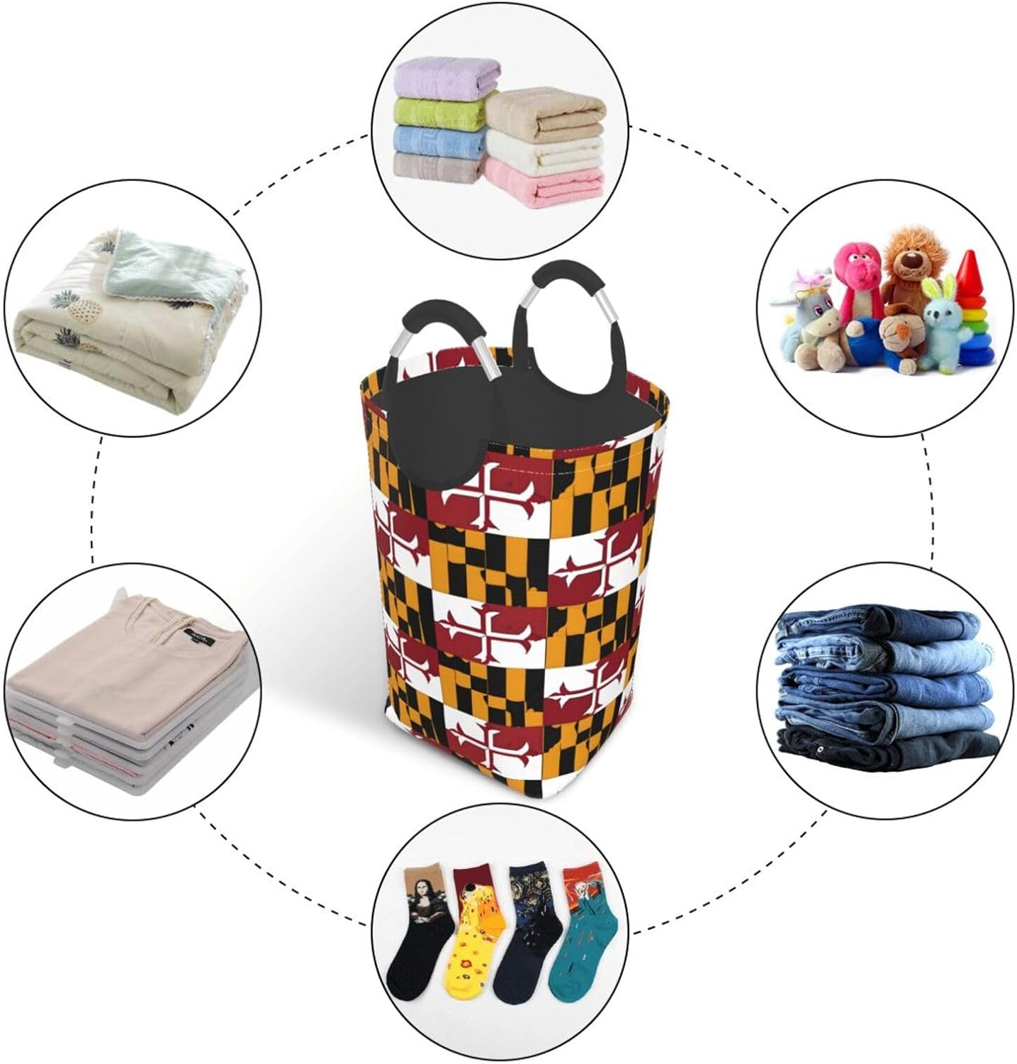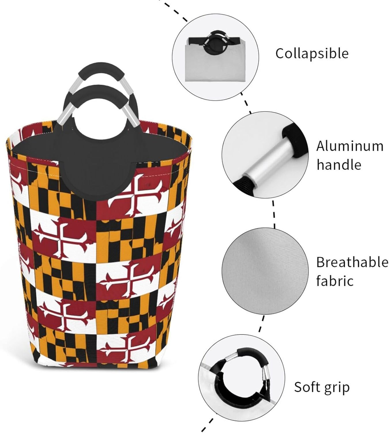 Product Name: Laundry Basket Material Type: Made of strong, wear-resistant and waterproof Oxford cloth, it can better protect and store your clothes. The bottom is supported by PE board, and the appearance is simple and light. Pattern: Flag of Maryland Size: 12.6 x 11 x 22.7 inchesAbout Our Laundry Basket: Product Performance - Large-capacity design: 50 liters of storage capacity, can accommodate weekly laundry, or can be used as an organizing box to store clothing, quilts, sheets, towels, toys, dolls, etc. Flexible storage: The whole thing is lightweight and can be folded and stored. When in use, it can be shaken flat and placed where needed. It can also be easily folded and stored when not in use, taking up no extra space, making it very suitable for travel or home storage. High-quality details: Equipped with 2 aluminum round soft-grip handles, which are sturdy and durable. When you need to do laundry, you can easily pick up the bracelet with one hand and carry it away. Or hanging on a hook will make it stronger and less likely to fall.Applicable People/Scenarios - Ideal for travel or use in the following places: home, dormitory, utility room, office, closet, hotel, toy room, laundromat and apartment or any place with limited space.Accessory Construction - 2 aluminum round soft-grip handles.Washing Instructions - It is recommended to wipe clean with a damp cloth or partially rinse with cold water. Do not machine wash or bleach as this may damage the bag.Special Note - Please note that due to different measurement methods, the size data may have an error of 1-3cm, which is normal. Customer Service : We want to make sure you have an amazing experience with us. Please contact us with any feedback you may have. We love to hear from you. We usually respond within 12-24 hours.