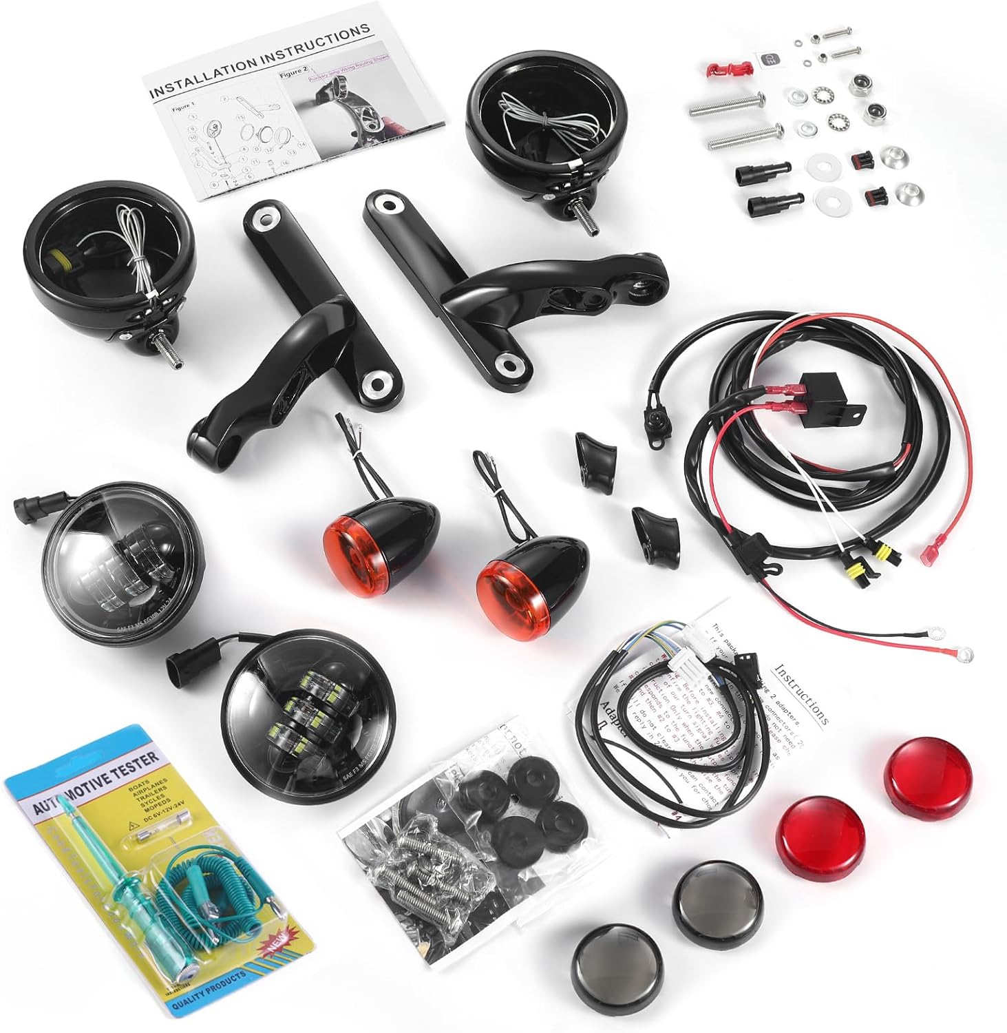 Fitment:2006-2023 street glide FLHX2014-2023 Street Glide Special FLHXS2012 Harley CVO Street Glide FLHXSE32011 Harley CVO Street Glide FLHXSE22010-2011 Harley Street Glide Trike FLHXXX1997-2016 Electra Glide 1994-2023 Road King models. ( Road King models equipped with windshield require separate purchase of Hardware Kit P/N 69235-04 . CVO Road King models require the purchase of additional components.)Does not fit Road Glide models. For installation on FLHRS models that do not presently have a windshield, but wish to install a windshield, the additional purchase of Hardware Kit P/N 69234-04 is required.FeaturesCondition: 100% brand newInstallation: For Plug and Play installation , but maybe need use your old connector!!!Shell Material: Diecasting aluminum alloy housingColor: same like pictures showColor Temperature: 6000K-6500KVoltage: DC10-32VPower: 30WLumen: 1450lmLight style: LEDIt is a high-performance drop-in replacement that retrofits stock harley fog lights upgrade your old bike with this new Custom DesignGet the unique look & outstandingWaterproof & Weatherproof and RustproofUV-resistant hard-coated polycarbonate lensRugged solid state LEDs can withstand shock & vibrationDie-cast aluminum housing provides maximum protectionPACKAGE INCLUDED:4.5'' LED Fog lights ,Passing lamp housings, retaining rings, mounting brackets, bullet turn signals, auxiliary lamp switch and harness connector hardware kits ,4 lens etc. same like pictures show .