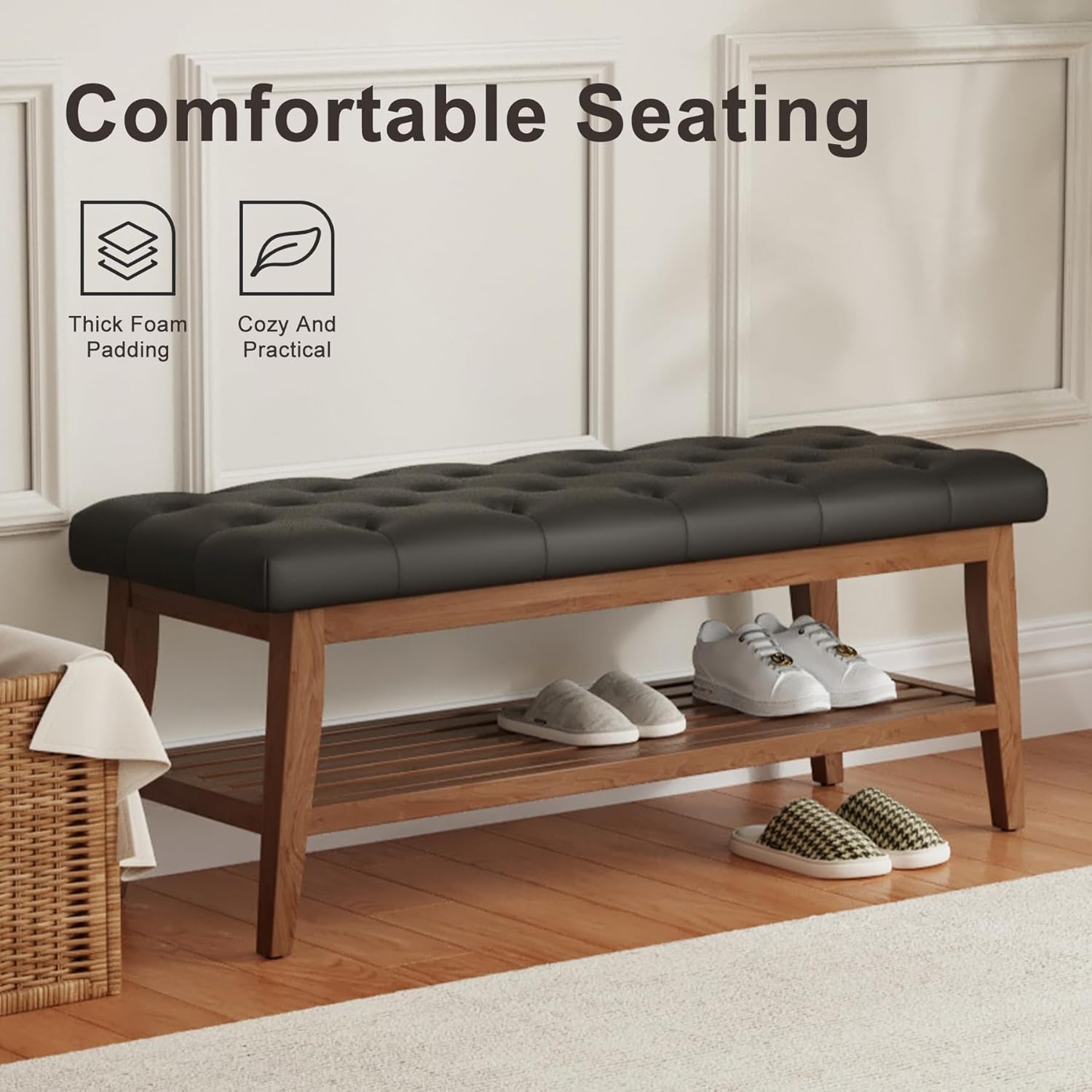 LEILISI Entryway Shoe Bench with Storage, End of Bed Bench, Microfiber Leather Upholstered Button-Tufted Seat Bench with Solid Wood Frame for Living Room, Bedroom (Black, 39.4'')