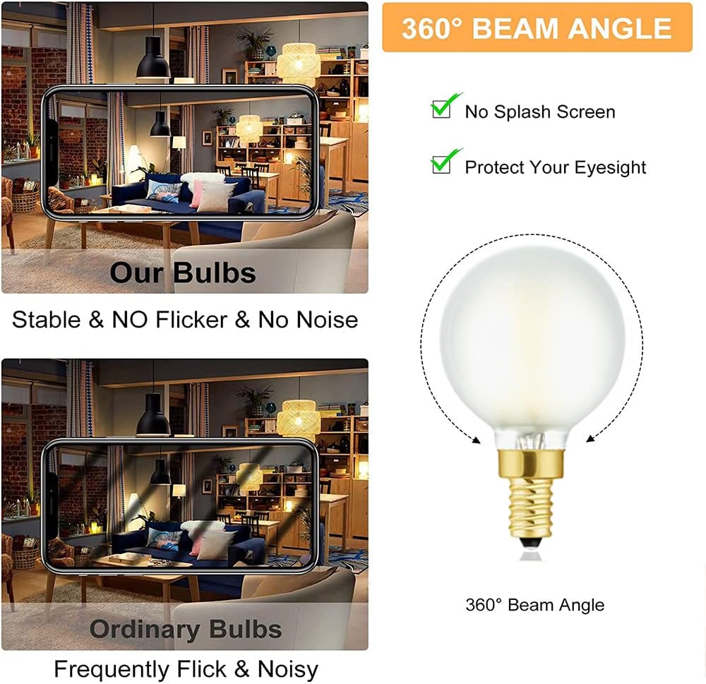 Leools e12 frosted bulb offers comfortable,cozy,relaxing atmosphere;no-flicker or strobe soft whitet 3000k g bulb protecting your family's eyesight;globe light bulbs is extensively applied in Indoor and outdoor lighting,Such as chandelier light bulbs,ceiling fan light bulbs,ceiling light bulbs,led vanity light bulbs,desk light bulb,Dining room light bulb,Bathroom light bulbs,reveal light bulbs,makeup bulb,Bistro Bar Lighting,wall fixture,accent fixture,Decoration,strings,etc ●What separates us from the competitions?● ☑ Light up your space instantly, without any delay. ☑ CE, FCC and RoHS certified. ☑ Dimmable. Fully compatible with following models after test: LUTRON:DVG-603P/DV-600P/DVSC-600P/S-600/S-603P/S-603PNL LUTRON:MSCL-VP153M/AYCL-153P/AYCL-253P/MRF2-6CL/6674 LEVTTON:6602-220/C22-6672-1LW/6684/6681/SAL-06P SPECIFICATIONS: ☪ Wattage: 4W ☪ Socket: E12 ☪ Size:3.18*1.97*1.97inch ☪ Voltage: 120V AC ☪ Lumen output: 400LM ☪ Color temperature:3000K (soft white) ☪ CRI: > 85+ ☪ Box included: 6 x 4W soft white LED Globe Bulb. Cautions: 1.Switch off the power before replace the lamp 2.Keep away from direct sunshine and too high temperature. 3.Indoor use only. 4.If any doubt about the installation or use of this product, please consult a competent electrician. 5.If you are not 100% satisfied with your purchase or there is any damage in transit we will make it right. We are committed to responding to any request within 12 hours.