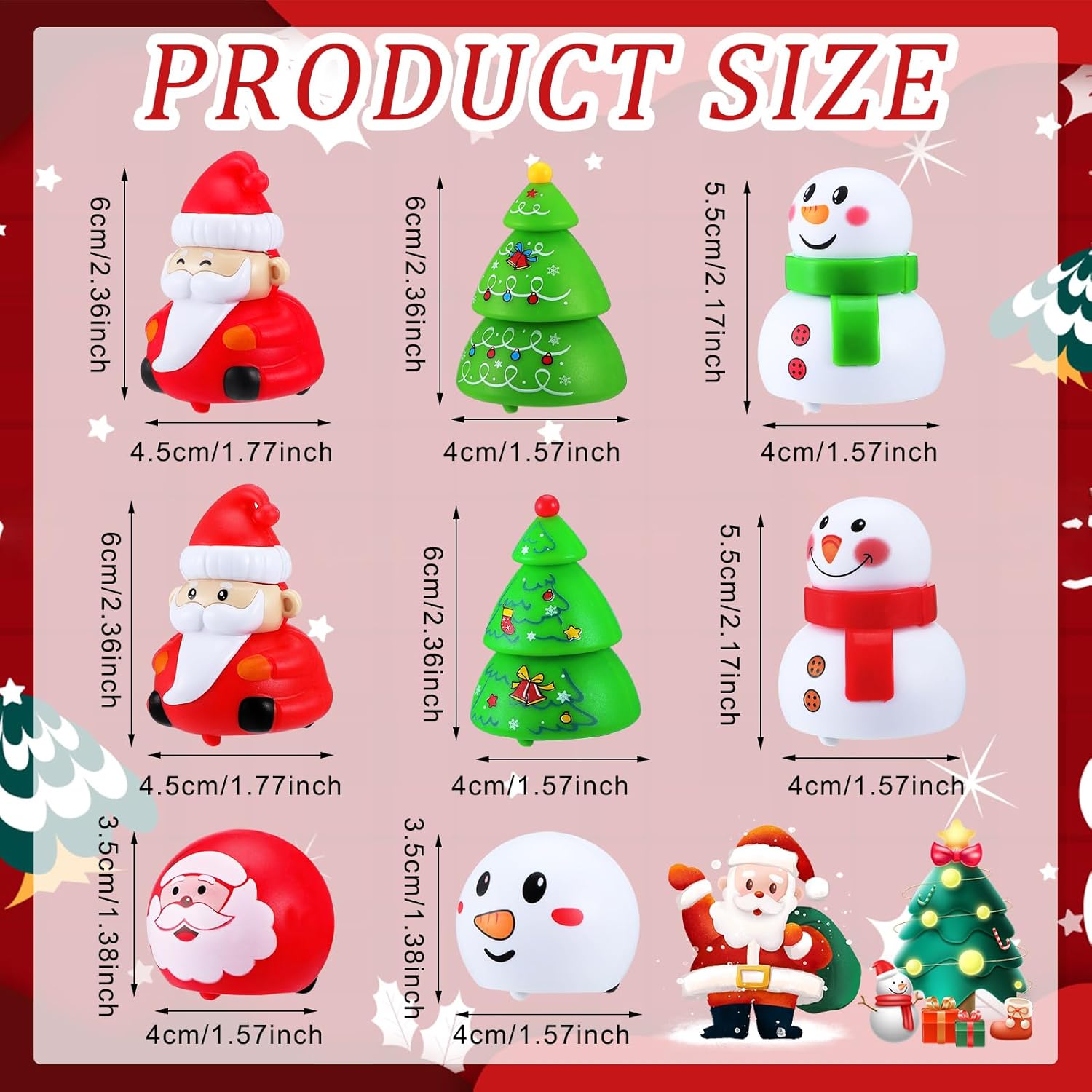 Features: You can share the mini pull back cars with your friend, and then have a racing game, to compare whose car run faster and run further, which will bring you much fun and joy The compact size allows you to easily store the Christmas car inside your pocket and bags without taking up too much space. Specifications: Material: plastic Color: as shown in the pictures Size: about 1.77-2.36 inches Package includes: 80 x Christmas car pull back cars (8 styles) Notes: Manual measurement, please allow slight errors on size. The color may exist a slight difference due to different screen displays. Little ones should use our product under the supervision of adults. Please keep it away from people under 12 years old