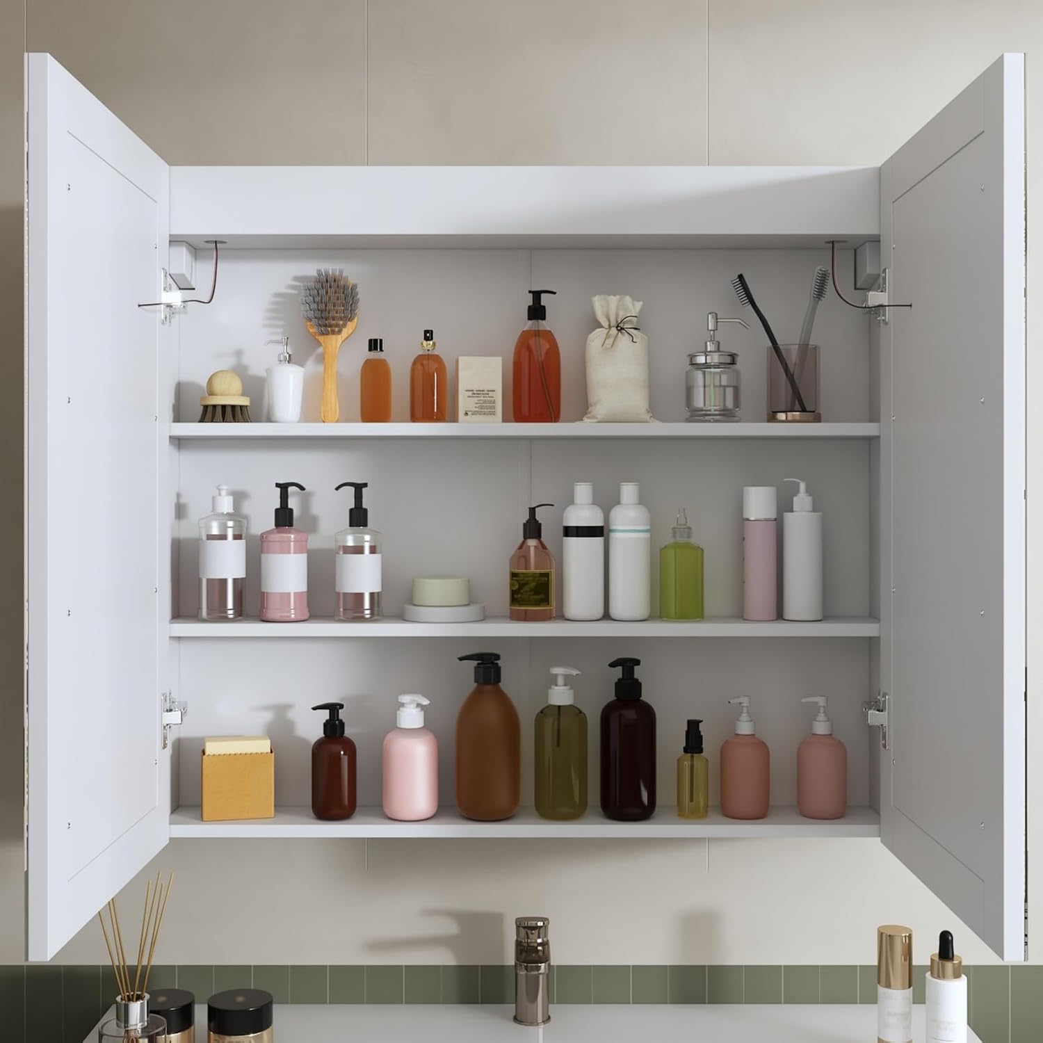 JOIKUJIA Lighted Medicine Cabinet with Mirror, Anti-Fog, 35” Bathroom Mirror Cabinet with Storage Shelf, Wall Mounted 2 Door Bathroom Storage with Adjustable LED Lights, White, 35.4”W x 31.5”H x 5.1”D