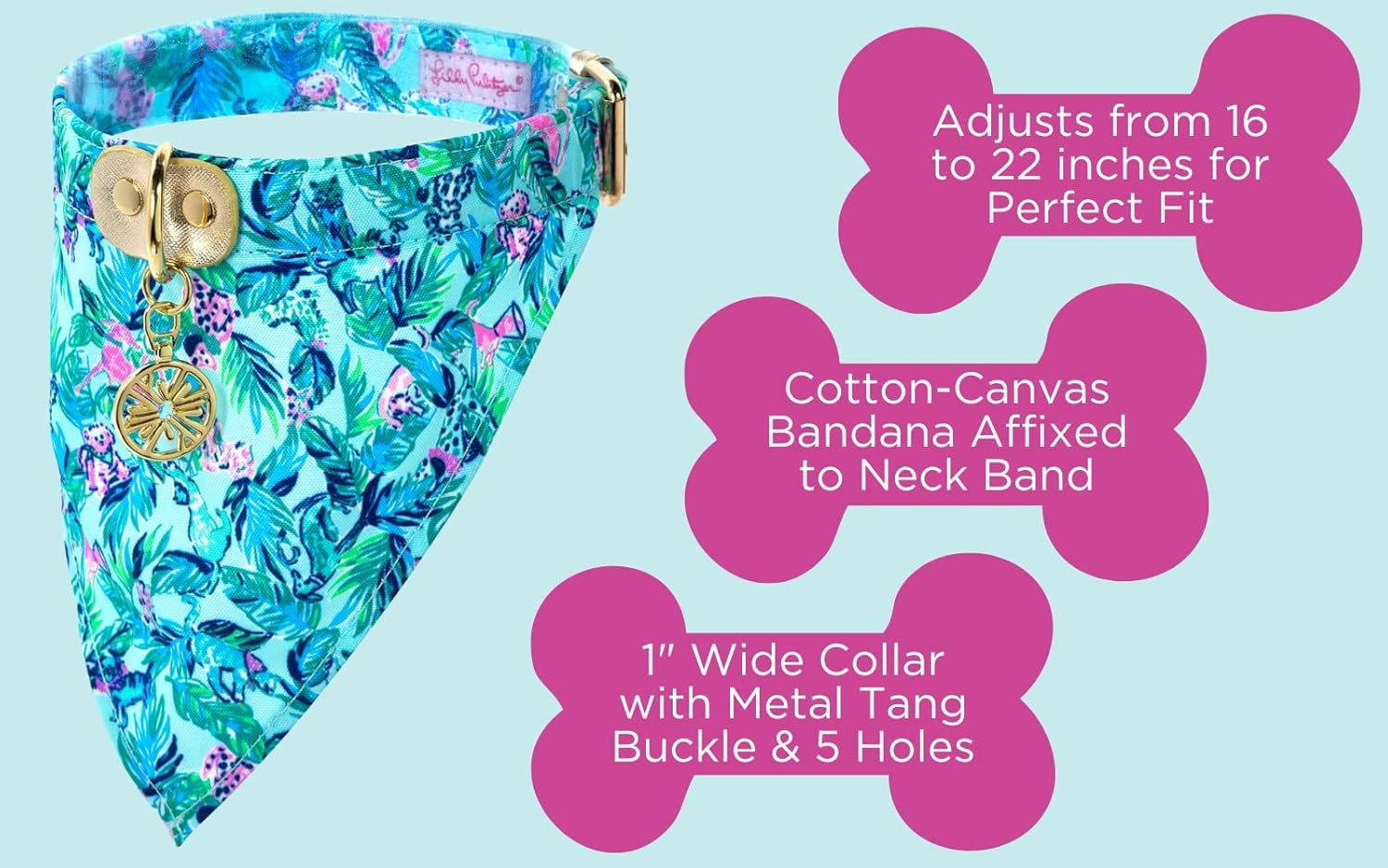Now your furry companion can have a Lilly wardrobe of its own! Featured in a bright Lilly pattern, this dog collar with bandana is sure to be a showstopper on your daily walk. Just as practical as it is pretty, this cute collar has secure metal hardware, fits small to medium size dogs, and is made of durable leatherette and cotton canvas materials that hold up to everyday use. Featured in a bright Lilly pattern, this dog bandanas for medium size dogs easily hooks onto a leash and is sure to be a showstopper on your daily walk. Take a break from working at home and enjoy a nice walk in style.