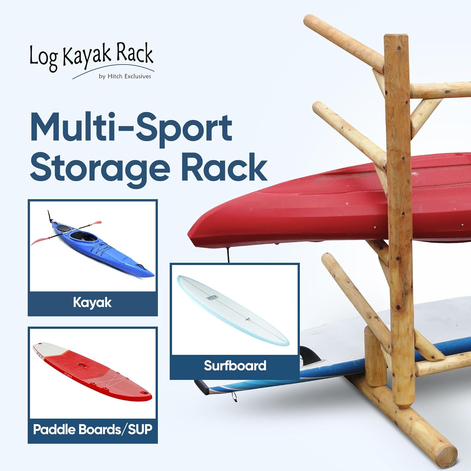 The 4-place One-sided freestanding Kayak or SUP Rack is built with Northern White Cedar from the Upper Peninsula of Michigan. This rack is designed for functionality and aesthetics by lake homeowners. It not only cares for and organizes your boats, but it can also be matched to its surroundings being log construction. With finishing options you can match dock, house, etc... or let it turn silver/gray with no finish, or you can use your own finish if so desired. This rack holds the heaviest of Kayaks, surfboards, and SUPS (Stand Up Paddle-boards). This rack is not designed for Canoes. Each boat can weigh up to 100 pounds. This rack has up to a 400-pound capacity. We have worked with logs for over 23 years crafting log homes, furniture, and kayak racks. Each joint is glued and screwed for longevity. We use glued mortise-and-tenon joinery wherever possible. Hand made and finished by Log Artisans in Northern Wisconsin.