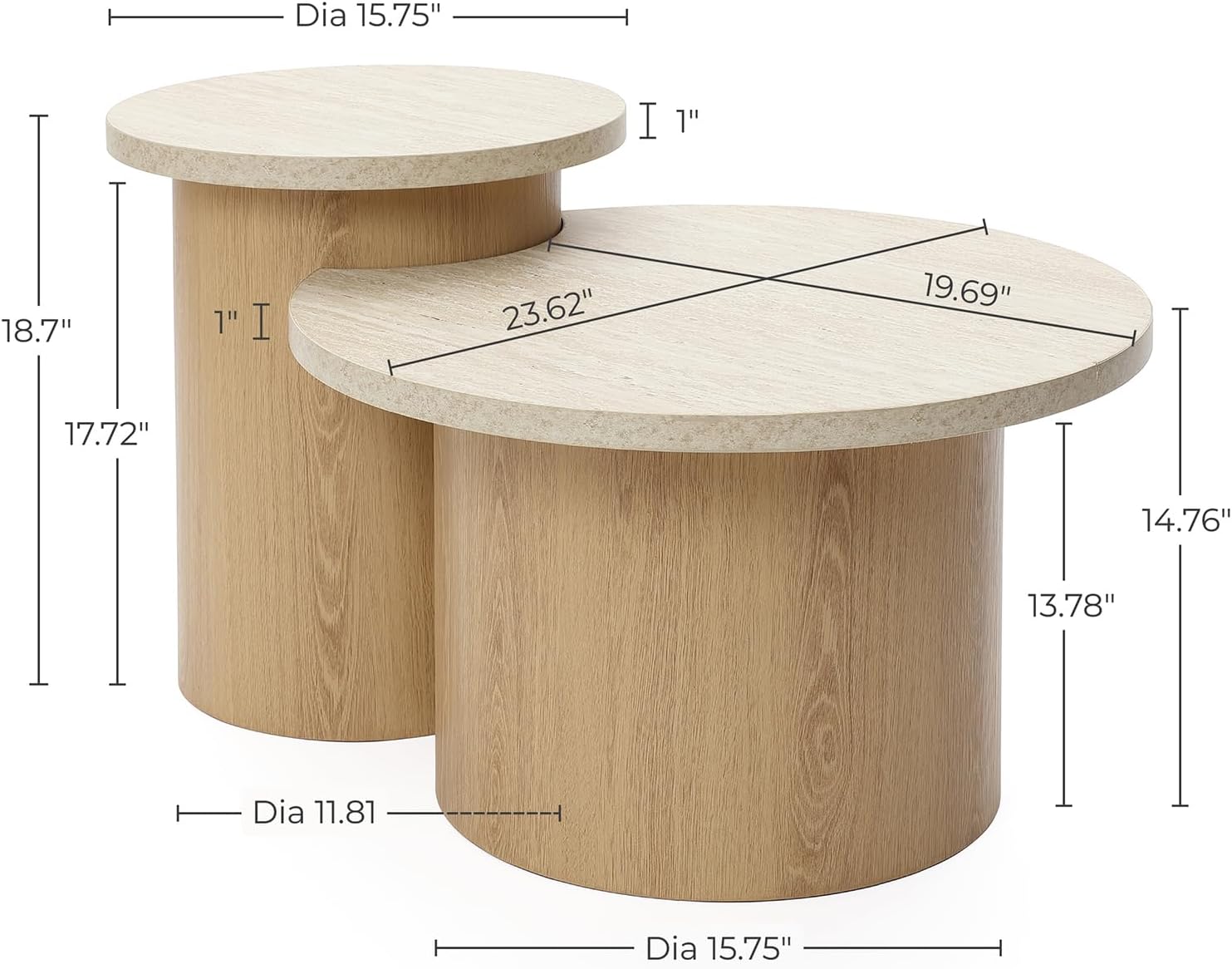 Double surfaces, half the footprint. This nesting coffee table set features two round tables that slide together when you need floor space and pull apart for extra room to serve coffee, display a plant, or park the remote. Each piece pairs a soft beige travertine-look top with a chunky, one-piece cylindrical pedestal base in a warm wood grain. Built from durable manufactured wood, the set brings a clean, modern vibe that fits right in with Japandi and Scandinavian decor. Style them together as a layered accent table set, or split them as round end tables around the room—perfect small-space furniture for any living room table layout.