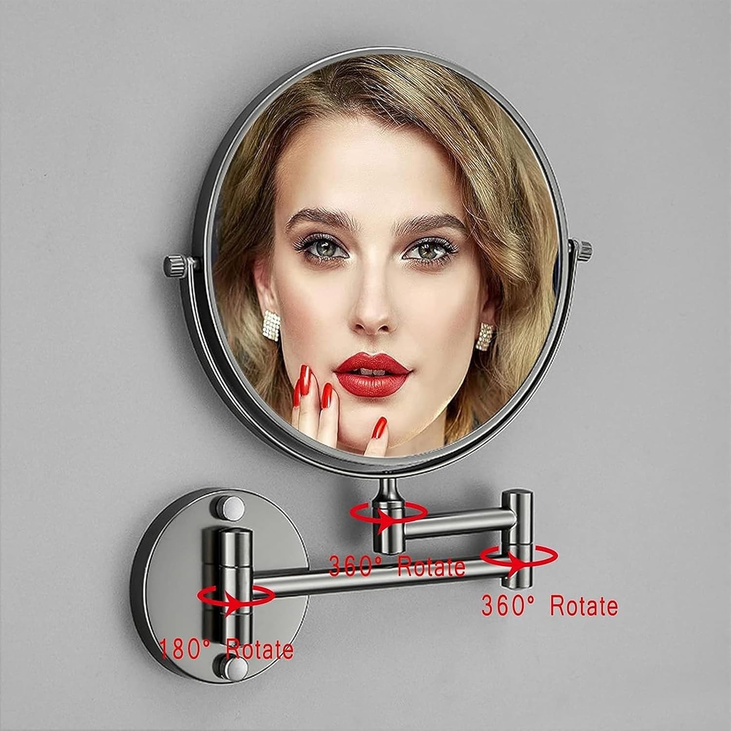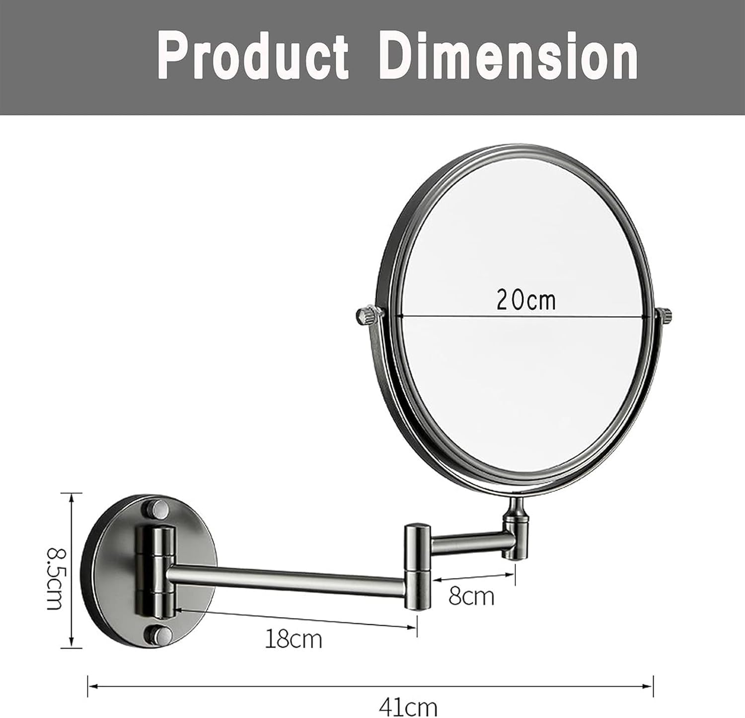 Features:1.Double-sided mirror with normal and magnifying mirror 2.360-degree swivel design and can be fixed at any angle you like3.Excellent quality with material, rustless,anticorrosive and durable 4.Easy to install, elegant design,would be suitable for any family and hote bathroom,etc5.Ideal for applying make-up,wearing contacts and shaving,ladies daily makeup and gentlemen shaving etcSpecification:Mirror surface: HD glassFrame: Space aluminumSurface treatment: electroplatingColor: Gold, Black, GrayShape: roundSize: 8Inch/20cmProduct weight: 0.464kgInstallation method: nail-free(Glue paste)The following walls are suitable for installation without drilling:Smooth wall: smooth tile, smooth marble, smooth glass, solid wood wall, smooth metalBump wall: bump tile, bump marble, frosted glass, bump metalTips:1. Rinse the surface of the bathroom rack with clean water frequently, and dry it with a soft cloth.2. It can be cleaned with neutral mild liquid and colorless glass cleaner3. Avoid contact with acidic cleaners, coarse material agents or abrasive cleaners