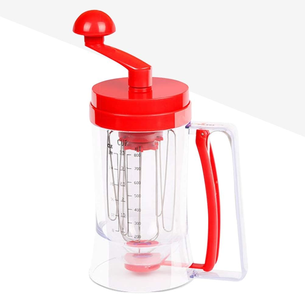 HGRVUTCFIDescriptionOur manual dispenser is designed to keep your batter nicely blended and prevent the clumping or clogging that can plague other batter dispensers. The metal whisk keeps your batter ready to pour, eliminating the need to remove the lid and stir.Features - Color: Red.- Material: Stainless steel and ABS.- Size: 11 x 6 x 20.1cm.Package Including1 x Manual Dispenser