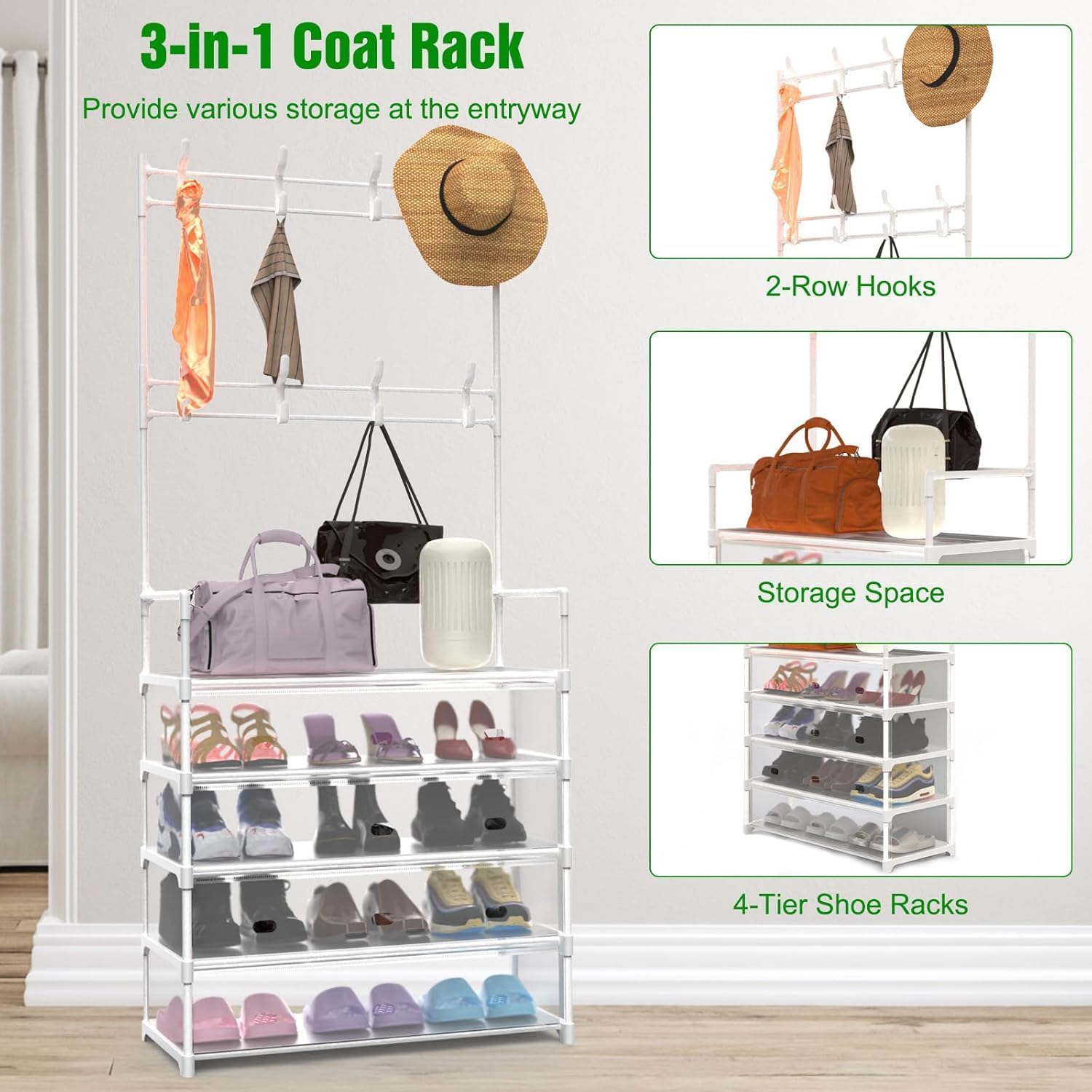 Transform your entryway into an organized oasis with this versatile metal hall tree and shoe rack combination. The sleek white frame features 8 removable hooks perfect for hanging coats, bags, hats, and accessories. The integrated shoe rack offers multiple tiers of storage space, accommodating various types of footwear while keeping them neatly arranged and easily accessible. The top shelf provides additional storage space for bags, plants, or decorative items, making it both functional and stylish. The dustproof design helps protect your shoes and belongings from accumulating dirt and debris. This hall tree's sturdy metal construction ensures stability while maintaining a modern, minimalist aesthetic that complements any home decor. Whether in your hallway, mudroom, or bedroom, this multi-functional storage solution helps maximize vertical space while keeping your belongings organized and within reach. The removable hooks allow for customizable arrangement to suit your specific storage needs. Product Type: Entryway Coat And Shoe Rack Material: Iron, PP Color Options: White Each Shoe Rack Layer Height: 17.5cm/6.88in Assemble Item Size: 35x77x168cm/13.77x30.31x66.14in Item Weight: 2.15kg/4.73lbs Package Size: 78*34.5*4.5cm/30.71x13.58x1.77in Package Weight: 2.45kg/5.4lbs Package Contents: 20x Longest Thin Tubes 4x Second Longest Thin Tubes 1x Longest Thick Tubes 4x Second Longest Tubes 2x Third Longest Tubes 20x Short Thick Tubes 10x Long Connectors 2x 4-Way Connectors 2x 4-Way Row Connectors 2x Elbow Connectors 8x Hooks 5x Interlayer Baffles 8x Side Baffles 4x Door Baffles 1x User Manual