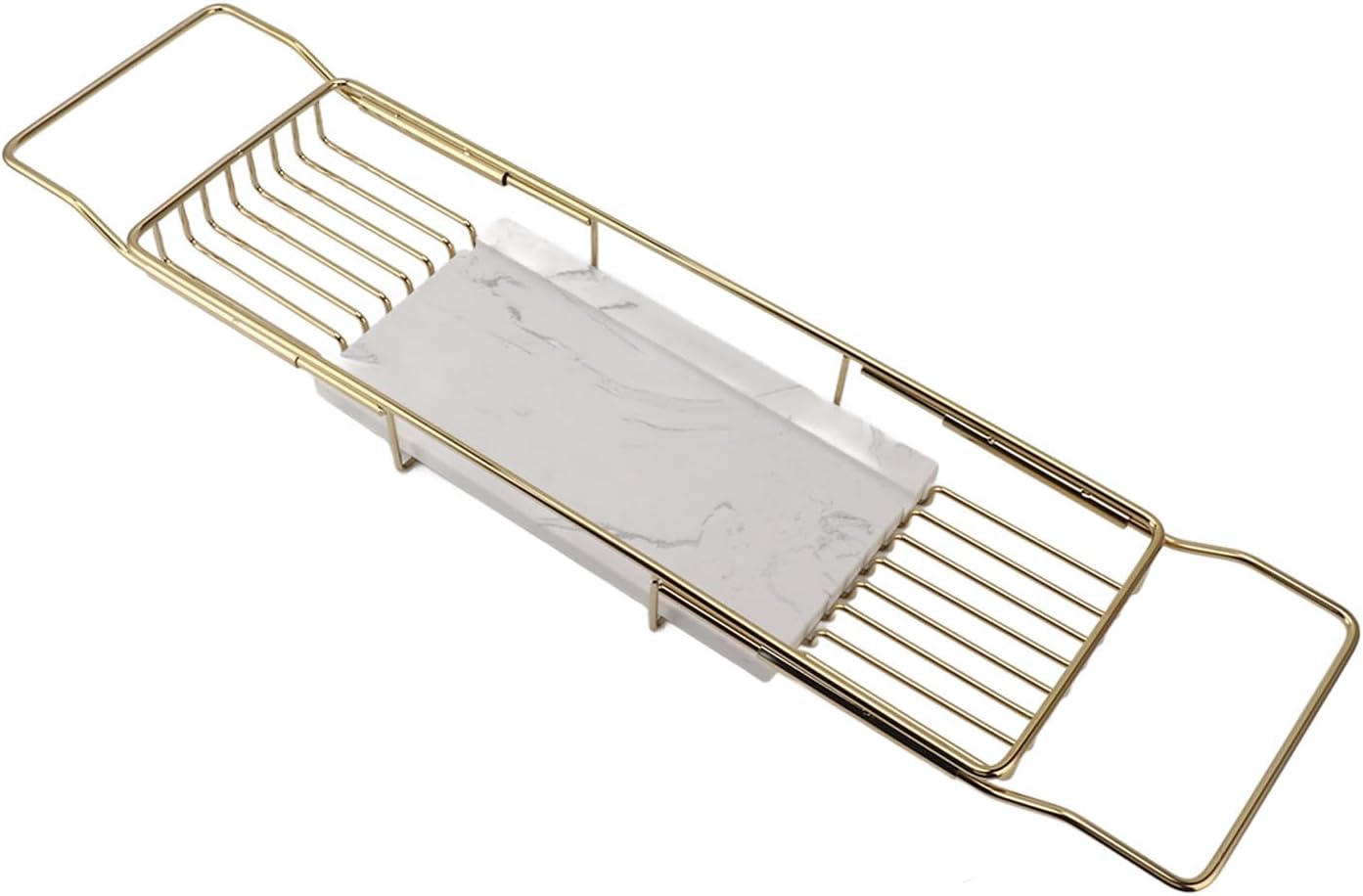 [PREMIUM QUALITY CONSTRUCTION] Crafted from durable stainless steel and elegant marble, this bathtub rack offers both strength and sophistication. The sturdy frame supports heavy items while the marble surface adds a touch of luxury to your bathroom. Multiple drainage holes prevent water accumulation, making it perfect for wet environments.[SMART SPACE-SAVING DESIGN] Transform your cluttered bathroom into an organized oasis with this innovative retractable shelf. The expandable design creates additional storage space when needed and tucks away neatly when not in use. Perfect for keeping bath essentials like shampoos, soaps, and loofahs within easy reach while maintaining a clean look.[VERSATILE MULTI-PURPOSE USE] More than just a bathtub accessory, this clever tray serves multiple functions throughout your home. Use it in the kitchen as a fruit/vegetable washing rack, in the shower to hold toiletries, or by the poolside for drinks and snacks. The adaptable design makes it useful in any room of your house.[SECURE ANTI-SLIP FEATURES] Enjoy worry-free relaxation with specially designed non-slip surfaces and secure slots. The marble top keeps items firmly in place while the raised edges prevent spills. Dedicated holders keep your wine glass steady, your phone dry, and your book accessible during long soaks.[EASY INSTALLATION & MAINTENANCE] Requires no tools or special skills to set up - simply place it across your bathtub and start organizing. The materials resist rust and , while the smooth surfaces make cleaning effortless. A perfect housewarming gift that combines practicality with elegant design.Spec:Item Type: Metal Marble Bathtub Rack Material: Stainless Steel, MarblePackage List:1 x Rack 1 x Marble Note:
