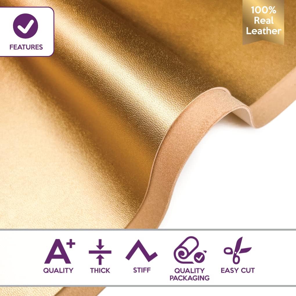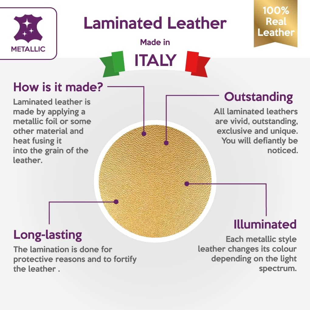 Metallic lambskin leather sheet made from genuine Italian leather. Soft, lightweight, and flexible material suitable for cutting, gluing, and sewing. Sheet size approx. 12x18 in (30x45 cm), thickness approx. 0.4–1 mm (1.25–2.5 oz). Smooth metallic gold finish. Suitable for jewelry making, leather accessories, craft projects, and decorative applications. Natural leather may show slight variations in color and texture.