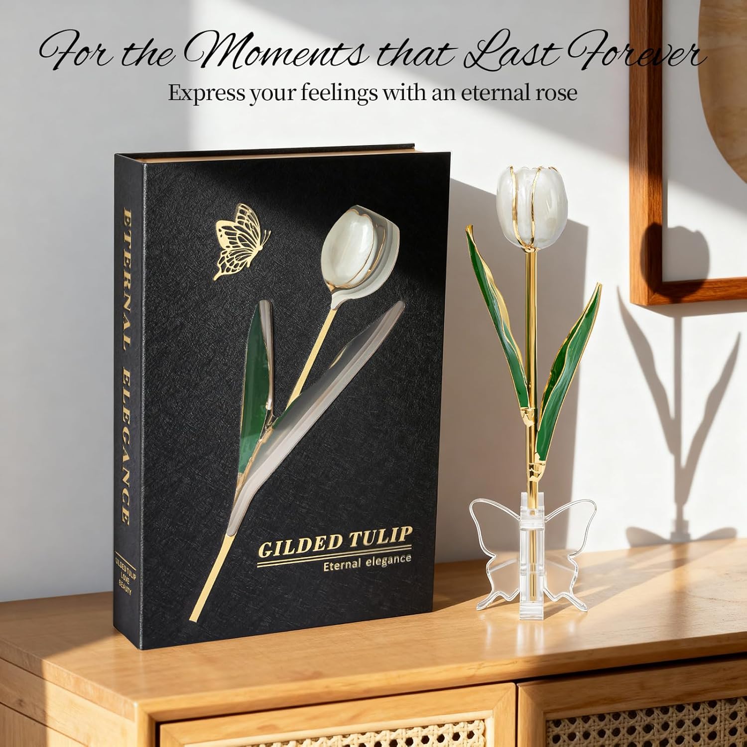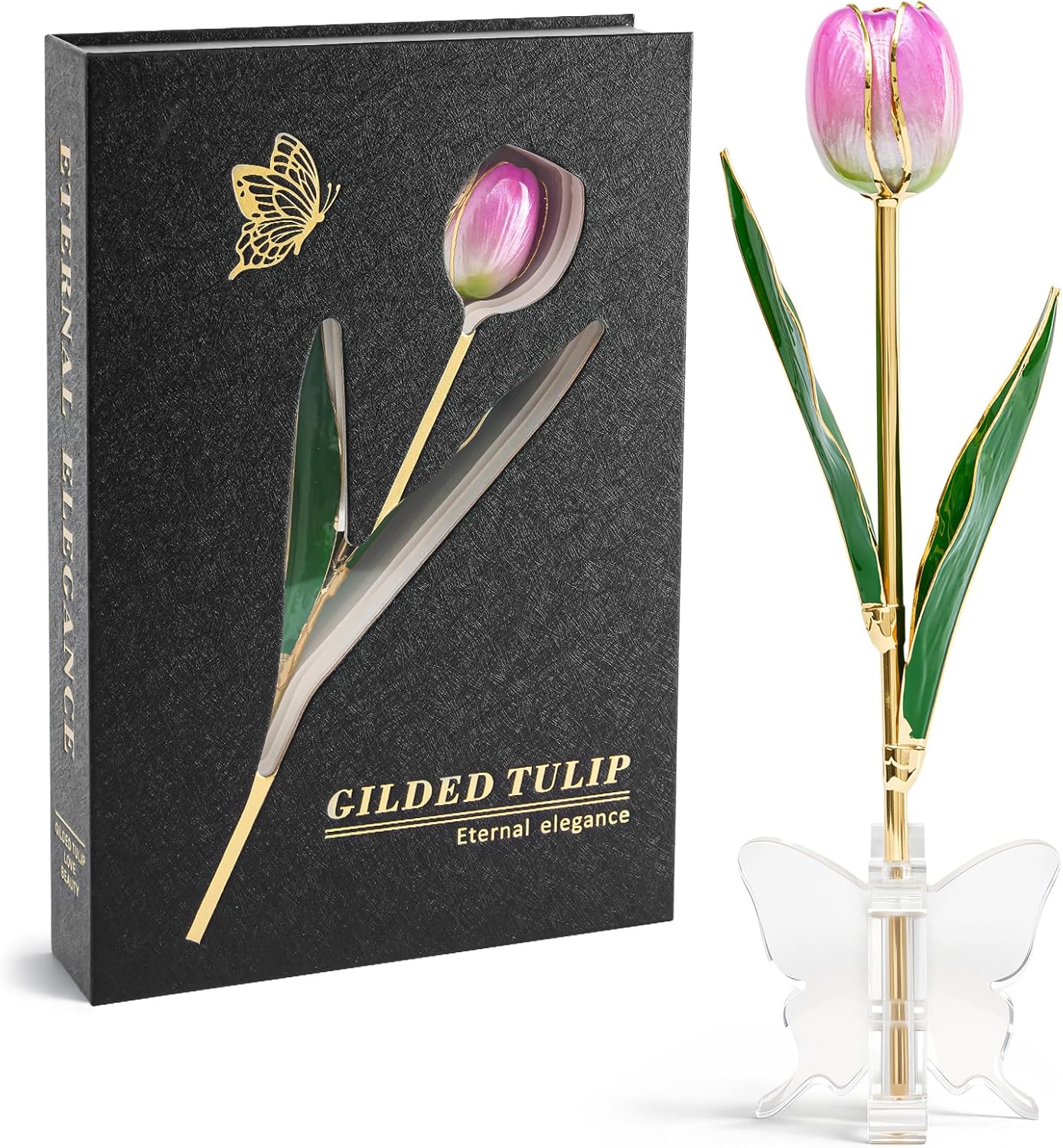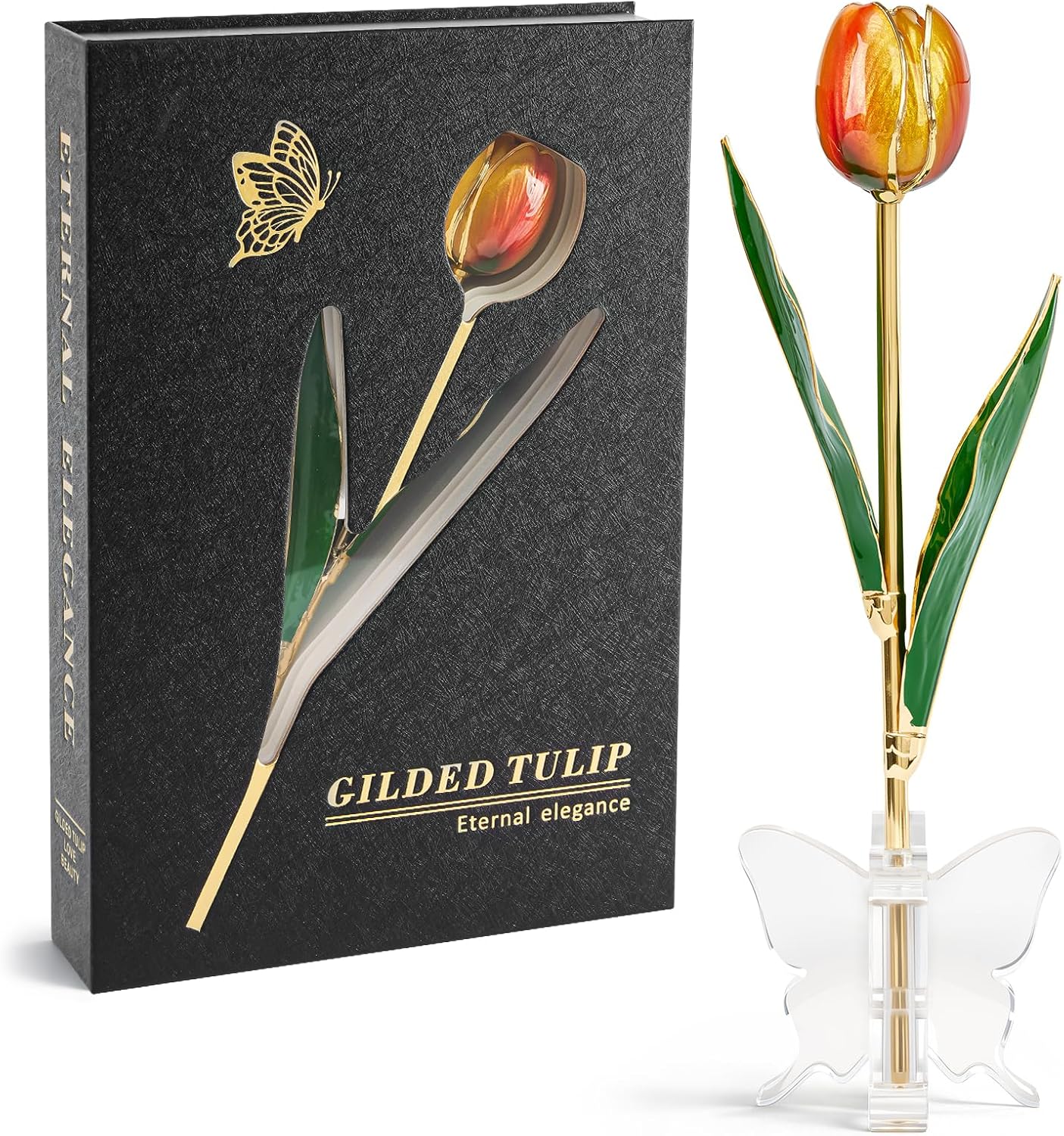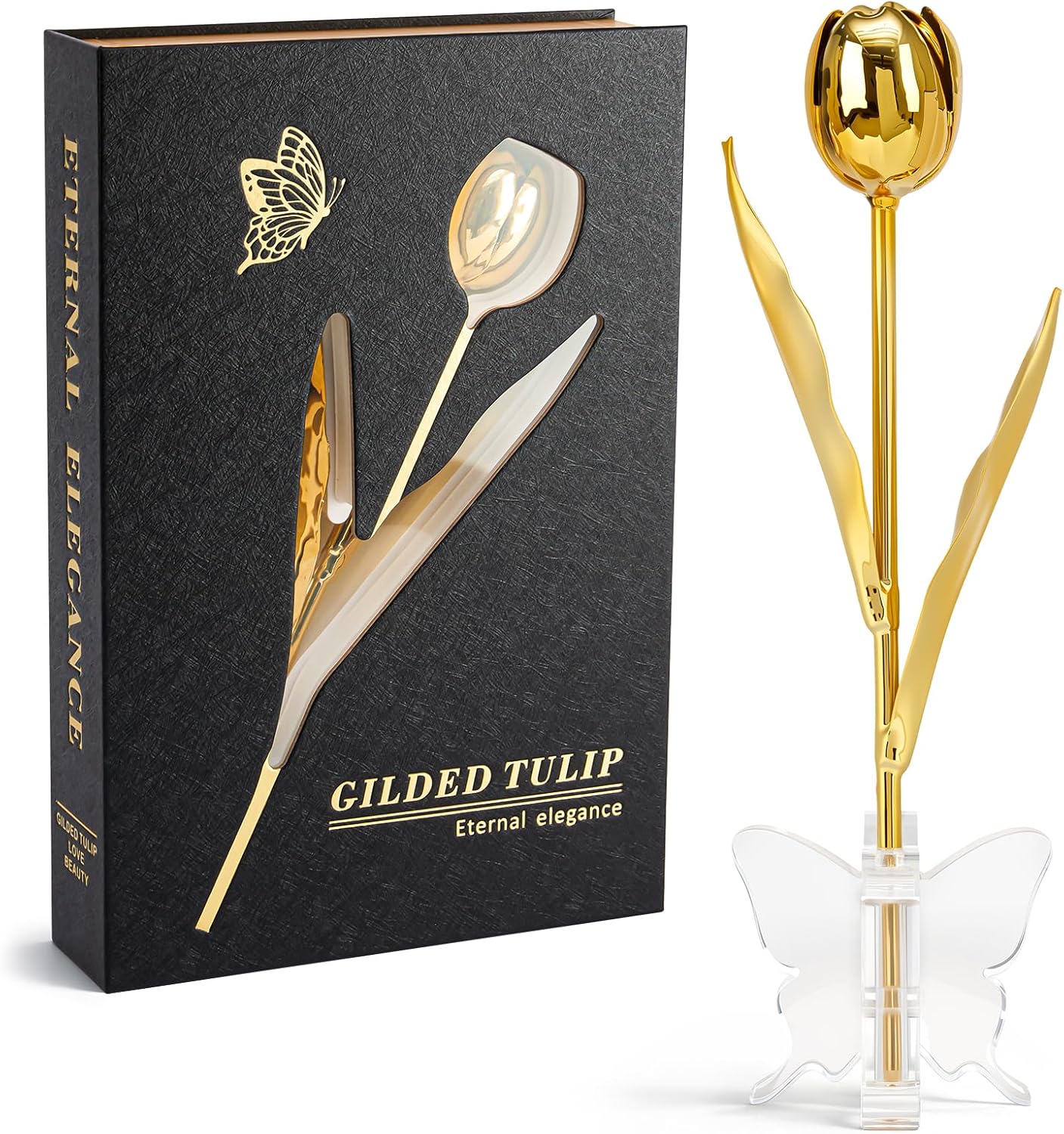 | Included Components | 1 ร Luxury Book-Style Magnetic Gift Box, 1 ร Real Tulip Hand-Dipped in Genuine 24K Gold, Stand |