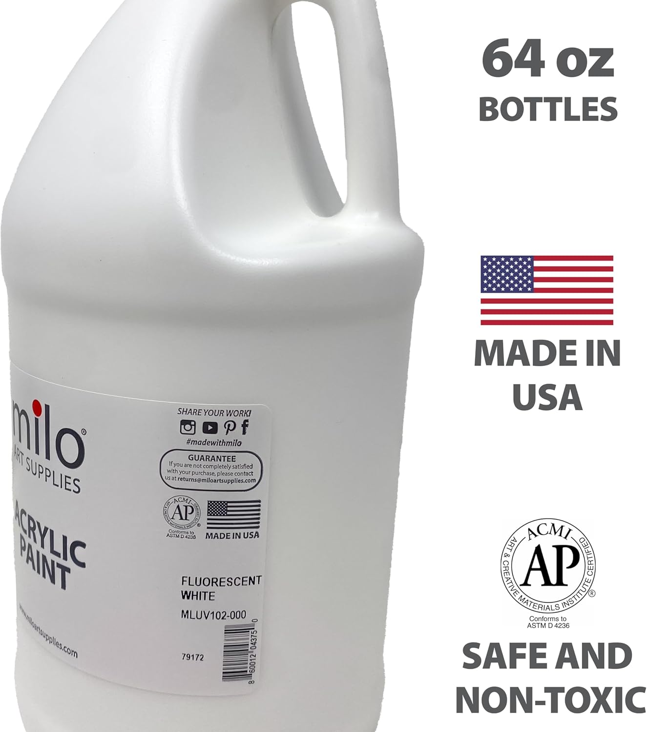 Command attention with the ultra-bright brilliance of milo's Fluorescent Yellow Neon Acrylic Paint! This bold, sunny color comes in an economical half gallon (64 oz) bottle, delivering superior coverage and the most intense, eye-searing glow in the spectrum, perfect for both fine art and electric event decor. Perfect for: professional artists, art students, classroom instruction, large decorative crafts, black light parties, theatrical and film props, and any project demanding long-lasting, brilliant, UV-reactive color. Light up your world—order your milo Fluorescent Yellow Neon Acrylic Paint today!