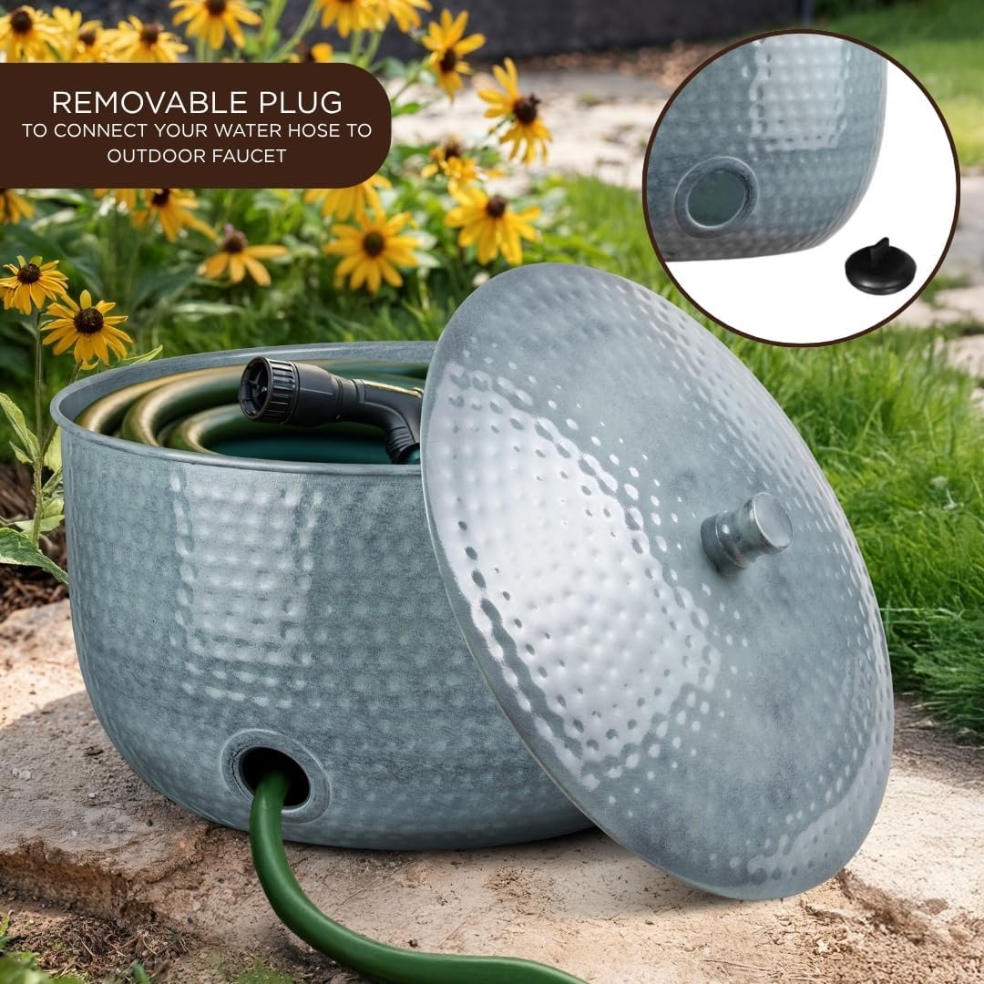 Tidy up your outdoor space in style with the Monarch Abode Hand Hammered Garden Hose Holder with Lid, a refined solution for organizing hoses while enhancing curb appeal. This decorative hose holder blends form and function, turning everyday garden hose storage into a stylish accent for patios, gardens, and yards.Designed to hold up to 100 feet of standard water hose, this spacious garden hose holder keeps hoses neatly stored and easy to access. Whether used as a hose pot, water hose holder, or hose container, it offers a clean alternative to wall-mounted reels and bulky racks, making it ideal for hose storage for outside use.Crafted from heavy-duty, powder-coated metal, this outdoor hose holder features a hand-hammered finish that resists rust, corrosion, and fading. Built for year-round performance, it stands up to sun, rain, and snow while delivering dependable water hose storage. A removable lid helps keep debris out, and a built-in drainage hole with a removable rubber plug prevents water buildup.Thoughtfully designed for everyday use, the interior center post allows smooth coiling and uncoiling to reduce tangles. Non-slip rubber feet keep the hose organizer stable and protect decks, patios, and garage floors from scratches. Lightweight yet sturdy at just 9 lbs., this hose holder is easy to reposition as needed.Versatile and visually appealing, this garden hose pot also functions as a hose caddy, garden hose organizer, or stylish hose holder for outside spaces. Perfect for patios, gardens, yards, balconies, or garages, it complements both modern and traditional outdoor décor.Overall dimensions measure 18 x 18 x 10 inches with a 4-inch lid height, featuring a wide base, center post for guided coiling, and 2-inch spigot side drainage opening for easy waterhose holder for outside access. The Monarch Abode Water Hose Holders for outside combine artisan craftsmanship, durability, and elegant design for premium hose storage you’ll be proud to display.