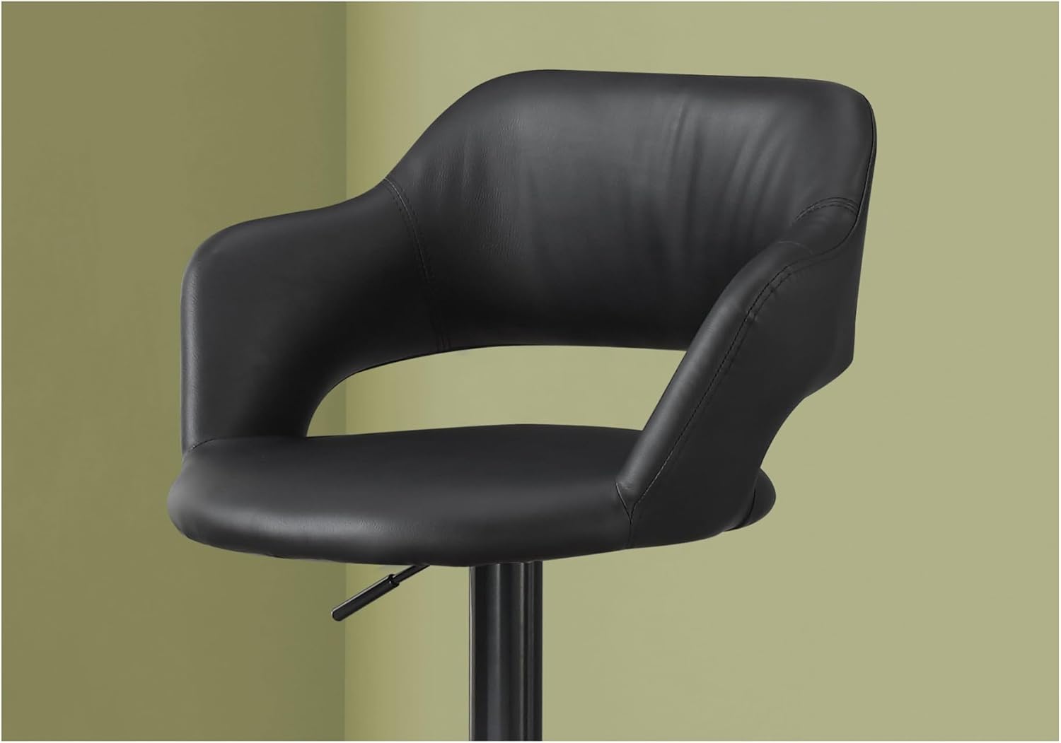 This cool contemporary bar chair will be a stylish addition to your Casual dining and entertainment area. The plush curved stool Back and Seat is covered in Black leather-look fabric to Complement your taste. A strong metal base in a Black Finish supports the chair. The hydraulic lift bar adjusts the Seat Height from 25 inches to 30 inches high with a chrome footrest below for comfort. Transform your home into a fun hangout with this stylish barstool.