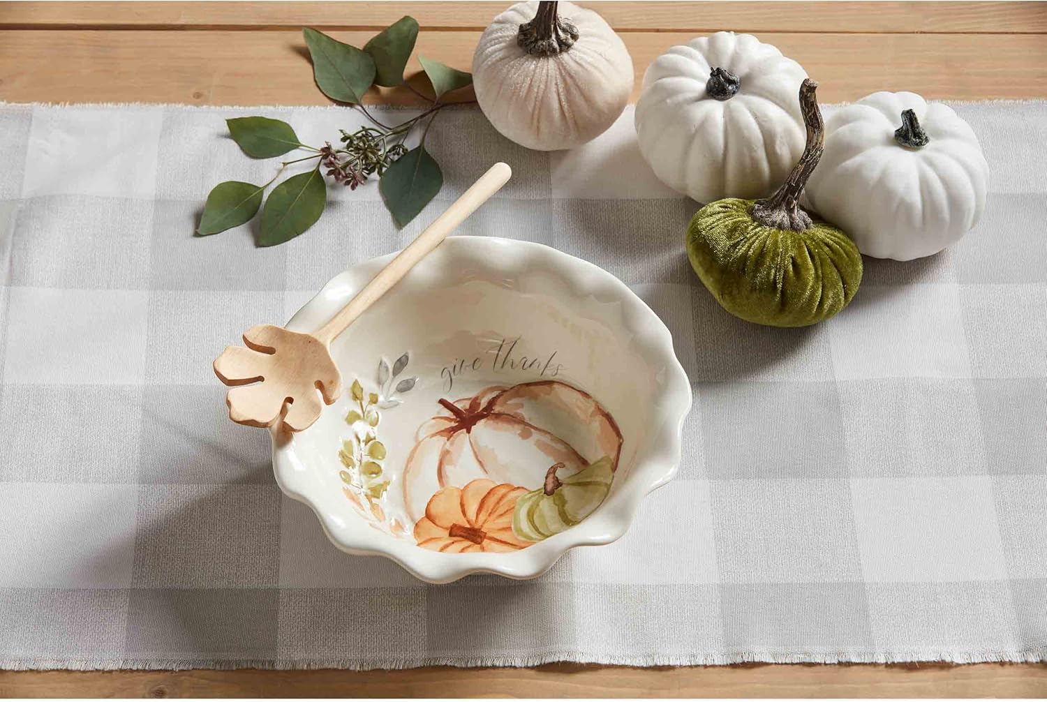 Share your favorite festive sides in our Gather Side Bowl. The bowl comes with two pieces. The set comes with a ceramic bowl. The bowl has a ruffle edge rim. The bowl features a pumpkin image. The bowl features the sentiment "Give Thanks". The bowl measures 9". The bowl has a 3" height. The bowl is dishwasher safe. The bowl comes with a wooden leaf serving spoon. The spoon measures 9 1/2" x 2 1/2".