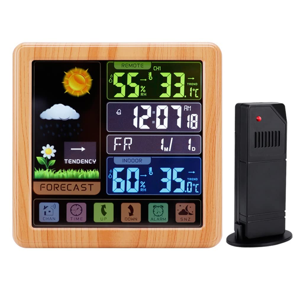 It has a sensorHanging and standing/wireless transmission/open transmission distance 100 meters, effective distance 30 metersTouch the keys to increase the fun of clicking Alarm clock function, button (SNZ) snooze for 5 minutesYou have your choice of three colors.It can be used in pet house, bedroom, bathroom, living room, kitchen and many other places.Small and light, save space, easy to carry.Product color: Wood grain/classic black/WhiteProduct weight: weather station :224g, sensor :34gProduct size: weather station :13.5*13.5*3cm, sensor :3.4*2*9.2cmScreen size :6.1 Package includes :1* hygrometer (not including other display items)The actual color of the item may vary slightly due to the brightness of the display and the brightness of the lightsDue to different measurement methods, please allow an error of 1-2cm.With compact and lightweight design, the mini hygrometer allows you easily put them in your pocket and take it anywhere you want