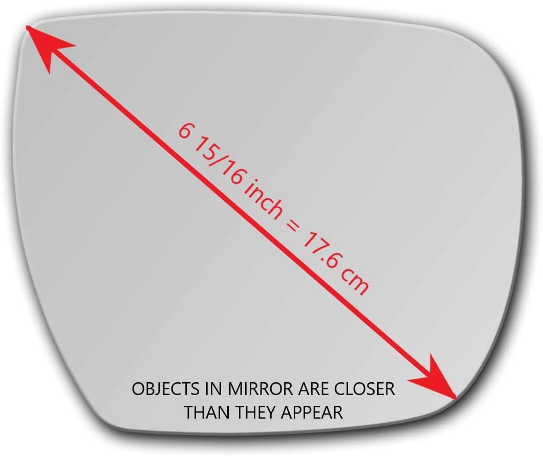 This mirror glass has Diagonal Measure (Longest): 6 15/16 inch = 17.6 cm Same year/make/model may come with different mirror shape or sizes depending on the markets they released in, options installed, or mirror may have been changed over the course of the life of the vehicle. Please compare actual picture and the longest diagonal dimension provided to your vehicle prior to order to make sure of ordering appropriate fit.
