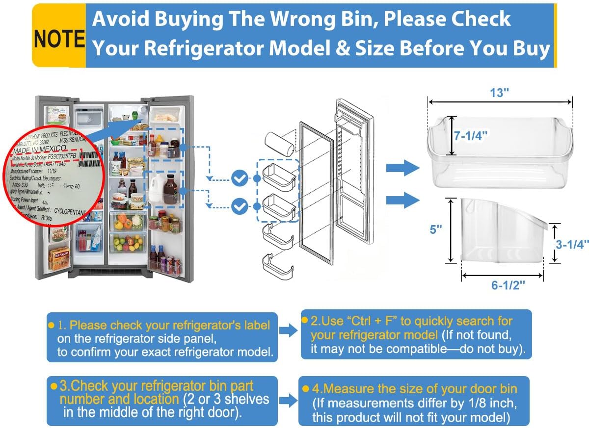• 【Notice Length 13"-ONLY FIT Top 2 Shelves】Suitability and durability are your first choice when you are concerned about refrigerator replacement 240324502 shelf bin parts. We use rigorous testing to ensure the suitability of our products for buyers' refrigerator shelves. Maximum Length: 13.11", Front Height: 5", Depth: 6.5". 𝐍𝐎𝐓 𝐅𝐈𝐓 240356402, 240363702, 216959802, 241505501, 241505301. Please check your refrigerator door shelf size carefully before purchasing