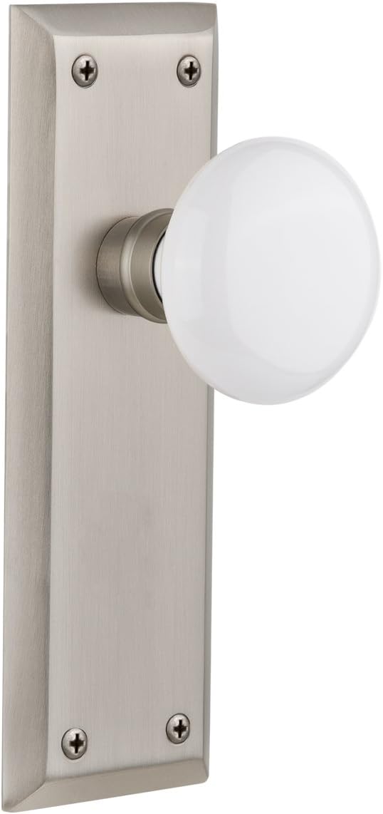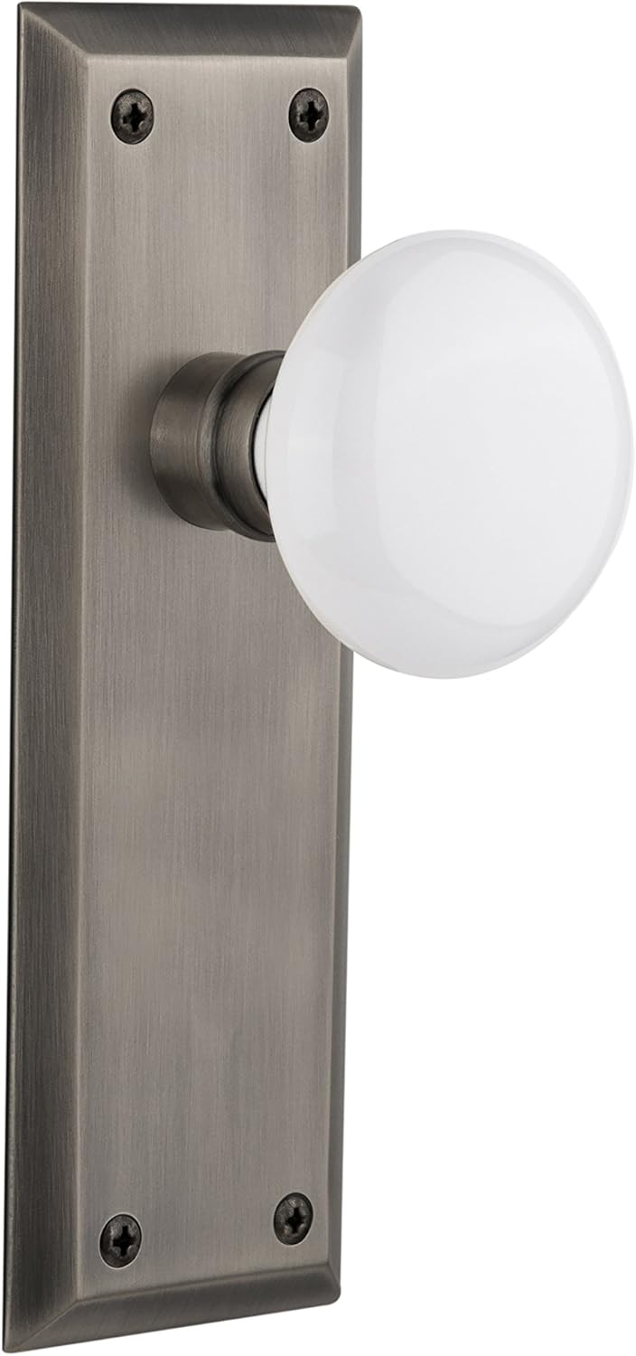Introducing the Nostalgic Warehouse New York Plate and White Porcelain Door Knob Set – A Timeless and Refined Addition to Your Home Decor! Elevate the style of your doors with the clean lines and tailored elegance of the New York plate and white porcelain knob. Both this distinctive door knob and plate exude classic, polished charm that will leave a lasting impression. Designed with homeowners, interior designers, and home décor enthusiasts in mind, our door hardware is versatile enough to suit your personal style. Whether you're collector searching for a distinctive accent piece or a home improvement enthusiast looking to add a touch of unique charm, the New York plate and white porcelain door knob will meet your expectations. Each piece is meticulously hand assembled in the USA and made from high-quality materials designed to ensure durability. Whether used as a bedroom door knob, bathroom door knob, or closet door knob, this antique door knob is sure to become a cherished part of your home for years to come. Installation is a breeze thanks to an easy-to-use design. The measurements are thoughtfully crafted to fit standard doors, ensuring a seamless integration. With this set, you can transform your doors into works of art.