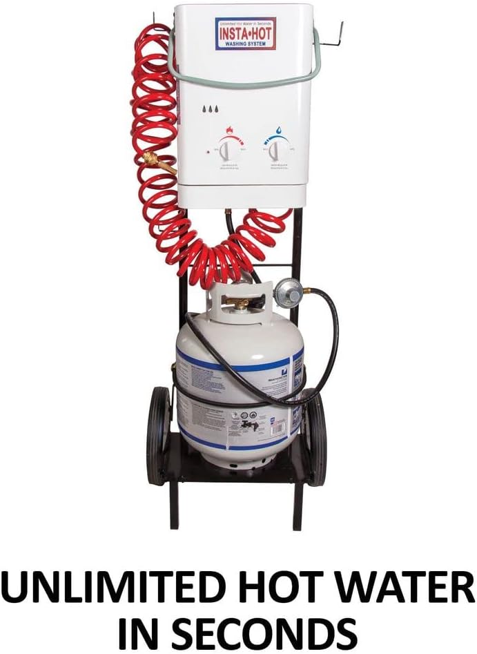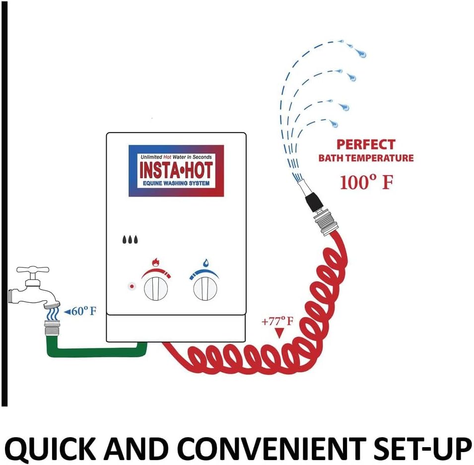 Insta-Hot Original RequirementsThe Insta-Hot Original requires a minimum of 20 PSI water pressure for proper operation. The safety tilt feature prevents the unit from operating unless it is fully upright. Requires (2) D batteries (not included). The unit should be stored in a dry, protected environment when not in use. Drain completely and blow out lines before exposure to freezing temperatures.You can use any standard 1/2" or 3/4" hose with the unit (larger diameter hoses may reduce pressure). Any standard hose nozzle can be used, but we recommend a brass twist hose nozzle to help maintain proper pressure to the unit.Note: Units have been tested up to 2,000 ft above sea level. For best performance, we recommend use below 2,000 ft. For every additional 1,000 ft above this level, performance may decrease by approximately 10%.Description:The Insta-Hot Original Portable Equine Washing System is a game-changer for every equestrian enthusiast. Tired of seeing your beloved horse cringe from cold water With Insta-Hot, those days are over. Within seconds, get warm water for a more enjoyable and stress-free bathing experience. Whether you're at the barn, horse show, or even on a camping trip, the compact design ensures you can bring the comfort of warm water with you. It's not just about the horses; this system can be a great addition to wash trucks, trailers, or to de-ice buckets during chilly winter months. Safety is paramount, and Insta-Hot is built keeping that in mind. From its water loss shut-off feature to its tilt safety mechanisms, you can be assured of a safe operation. The device operates efficiently with a standard propane tank and ensures prolonged hours of warm water for all your needs. Dive into the world of convenient warm water with the Insta-Hot Original Portable Equine Washing System. Perfect for every farm, barn, and equestrian lover.