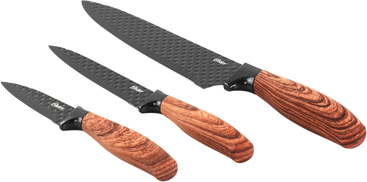 Get slicing and dicing with this Oster Gunderson 2 Piece Black Stainless Steel Cutlery Set. The set includes one 6.5" cleaver, one 8" chef knife, one 5" utility knife, one ceramic peeler, one kitchen shears, and one cutting board. All utensils feature durable stainless steel blades for a razor sharp cut and textured nonstick technology that prevents rust and promotes easy food release. It is recommended to hand wash the items so they can stay in prime condition for years to come. Anyone can be a five star chef with this fantastic knife set! Item Dimensions: 15.50" x 10.25" x 1.50" Item Weight: 2.80lbs