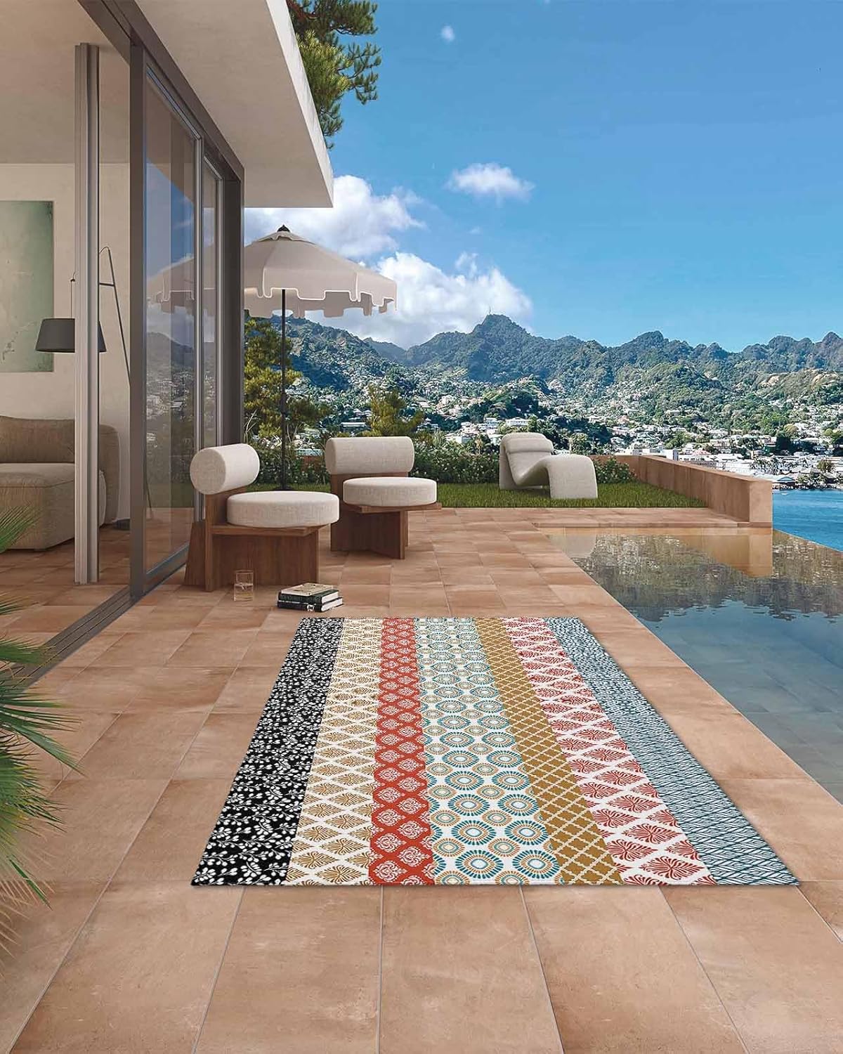 This outdoor rug for the patio, apartment balcony, or bed room living room dining room is derived from high quality material that is heat treated to avoid fraying, soft and durable, low-maintenance. SIZES: 4' x 6', 5' x 8', 6' x 9', three size are perfect for any indoor/outdoor decoration. These versatile and functional rugs, outdoor mats, rv patio carpets, are great option to elevate any entertainment space including patio, deck garden, beach, apartment balcony bed room living room dining room kids rooms. For a quick clean simply sweep away dirt with water and airing it dry. Reversible outdoor rugs can be folded into compact size for easy storage and convenient. Suitable for an afternoon outing or an RV road trip.Give your patio, deck, or porch an instant look with an outdoor rug; it is durable enough for high-traffic spaces and an easy-care option for living areas and children's bedrooms. This rug is stain resistant and pet friendly at the same time.With timeless design, this reversible patio mat is elegant as it is functional, use on your patio with outdoor furniture and accessories to show off your personal style.