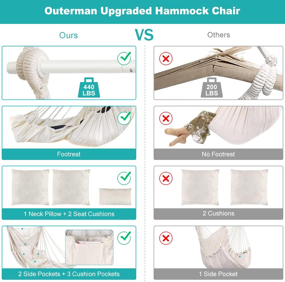 | Included Components | Hammock Chair * 1, Neck Pillow * 1, S hook * 1, Seat Cushions * 2, Spread Bar * 3 |