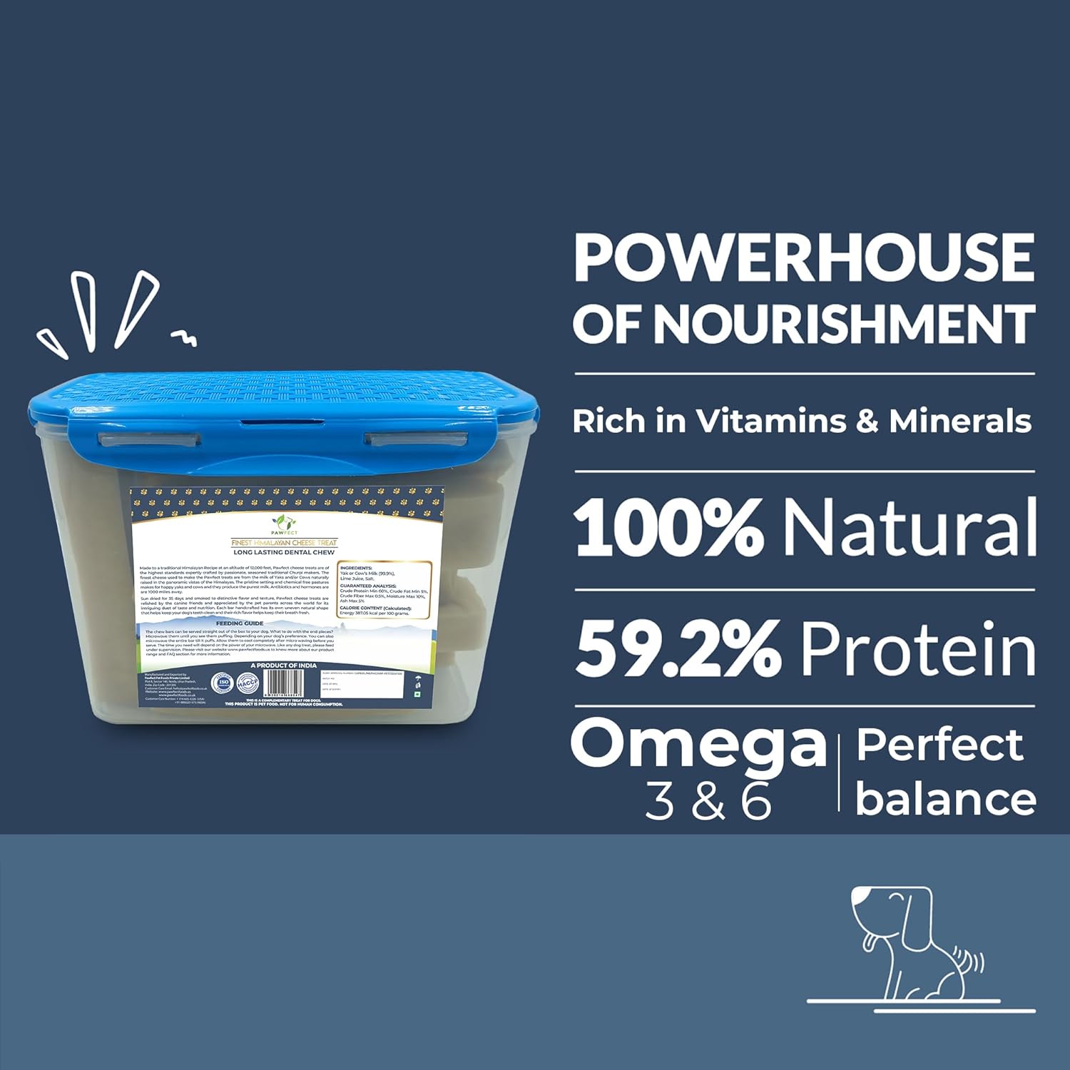 "A Natural way to clean your dog's teeth, freshen breath, reduce plaque and tartar- all while they relish their favourite Himalayan Cheese Chew infused with the finest natural ingredients. ✔️ 100% Himalayan Cheese: Provides high-quality protein and calcium for strong bones and muscles. ✔️ No Artificial Additives: Free from preservatives, fillers, and artificial flavors. ✔️ Grain & Gluten-Free: Ideal for dogs with dietary sensitivities. ✔️ Human-Grade Quality: Only the best ingredients for your dog’s health."