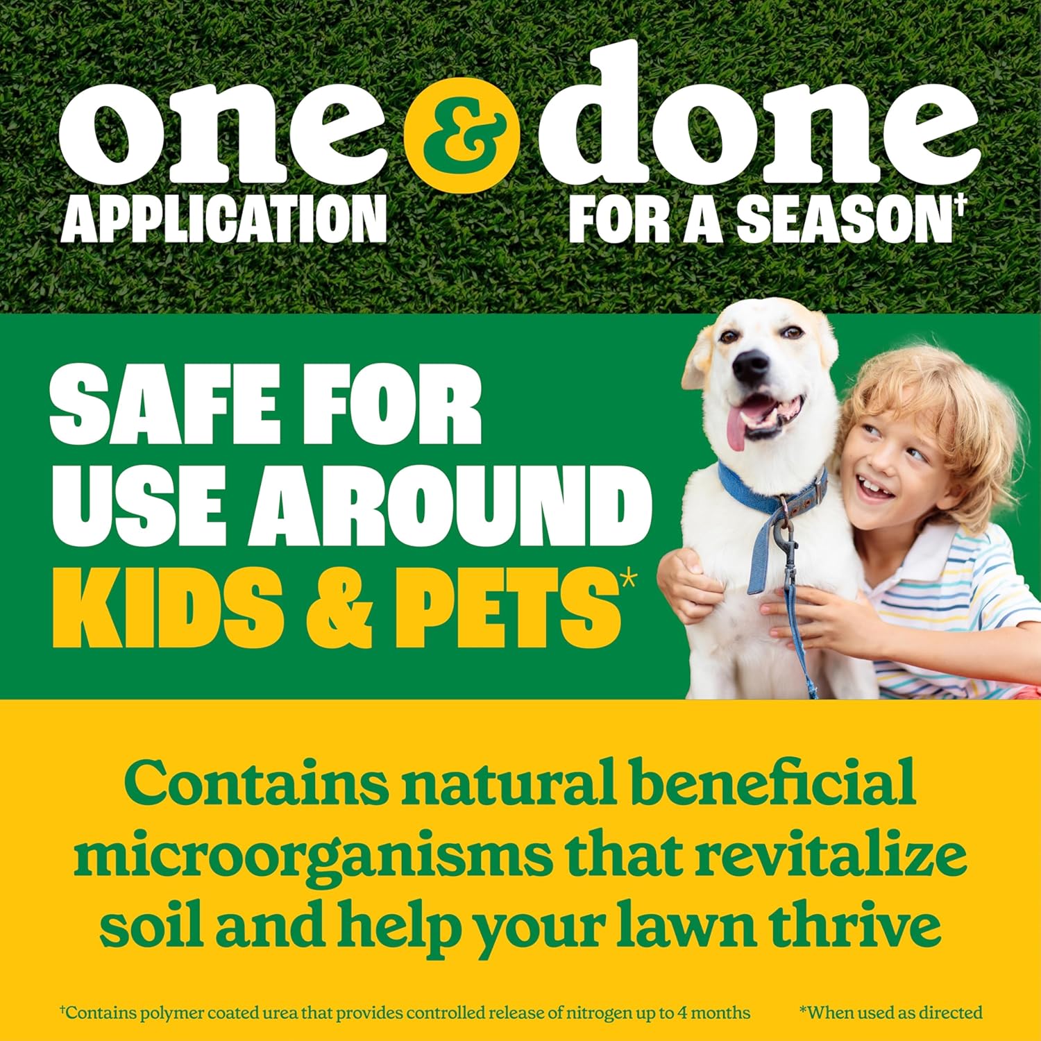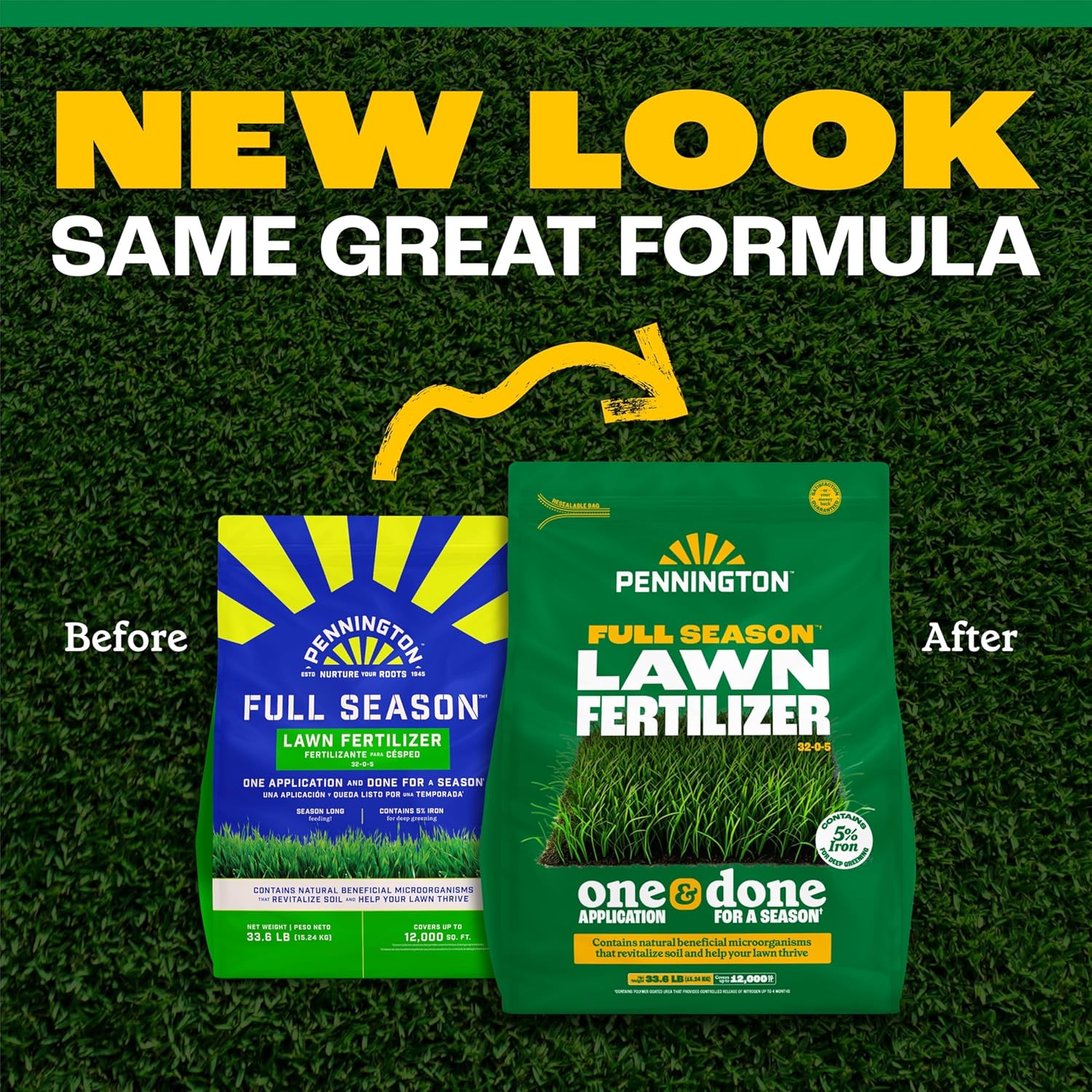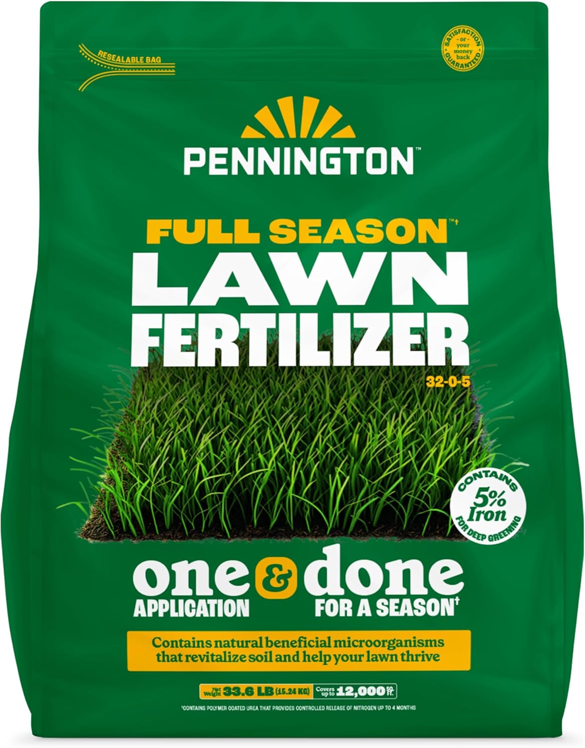 Introducing Pennington Full SeasonTM + Lawn Fertilizer 32-0-5 – your easy solution for a vibrant and lush lawn all year round. All it takes is one application and done for a season! This innovative formula contains polymer coated urea that slowly releases nitrogen up to 4 months. The added 5% iron, encourages a deep and captivating green lawn. The powerful fertilizer contains natural beneficial microorganisms that revitalize soil and help your lawn thrive. The blend adds essential plant nutrients to help give you the thick, green lawn you desire. Each bag holds 11.2 LB of fertilizer, covering up to 4,000 square feet using a lawn spreader. To maximize results, mow and water your lawn 1-2 days before application and apply only to actively growing turf. Do not apply if heavy rain is expected. Elevate your lawn care routine and experience the joy of a stunning lawn, season after season, with Pennington Full SeasonTM + Lawn Fertilizer 32-0-5.