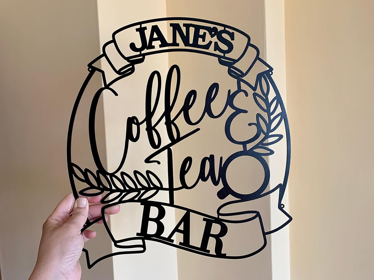Custom Coffee Bar and Tea Sign. !!! The rose from the first picture is just a photo prop and is not included in the package !!!The Perfect Gift: Give the decorative wall art to a coworker, friend, or family member at an upcoming housewarming party, birthday, or holiday gathering Easy to hang: There are 4 holes on the sides for hanging. Dimension: We have two sizes. (please see photo #3) - 10 inches x 12 inches - 14 inches x 16 inches Colors of the metal sign (see picture #4): Black, Red, White, Gold, Silver, Copper We can customize anything with the design. If you would like something changed just let us know. Made from metal or wood material and painted in different colors. Makes the perfect gift for anniversaries, birthdays, etc. We can produce these name signs in 1-3 business days after your order.