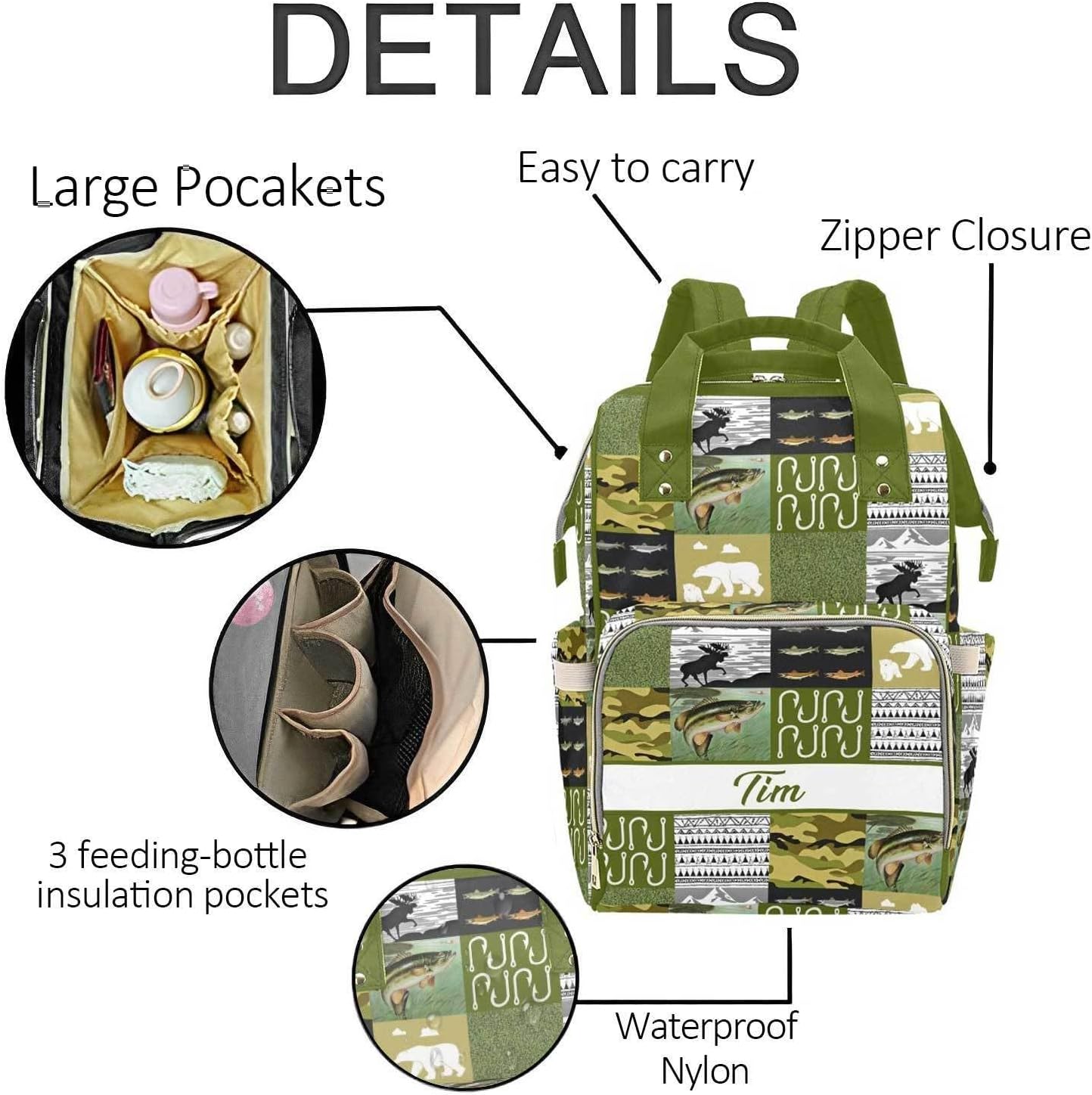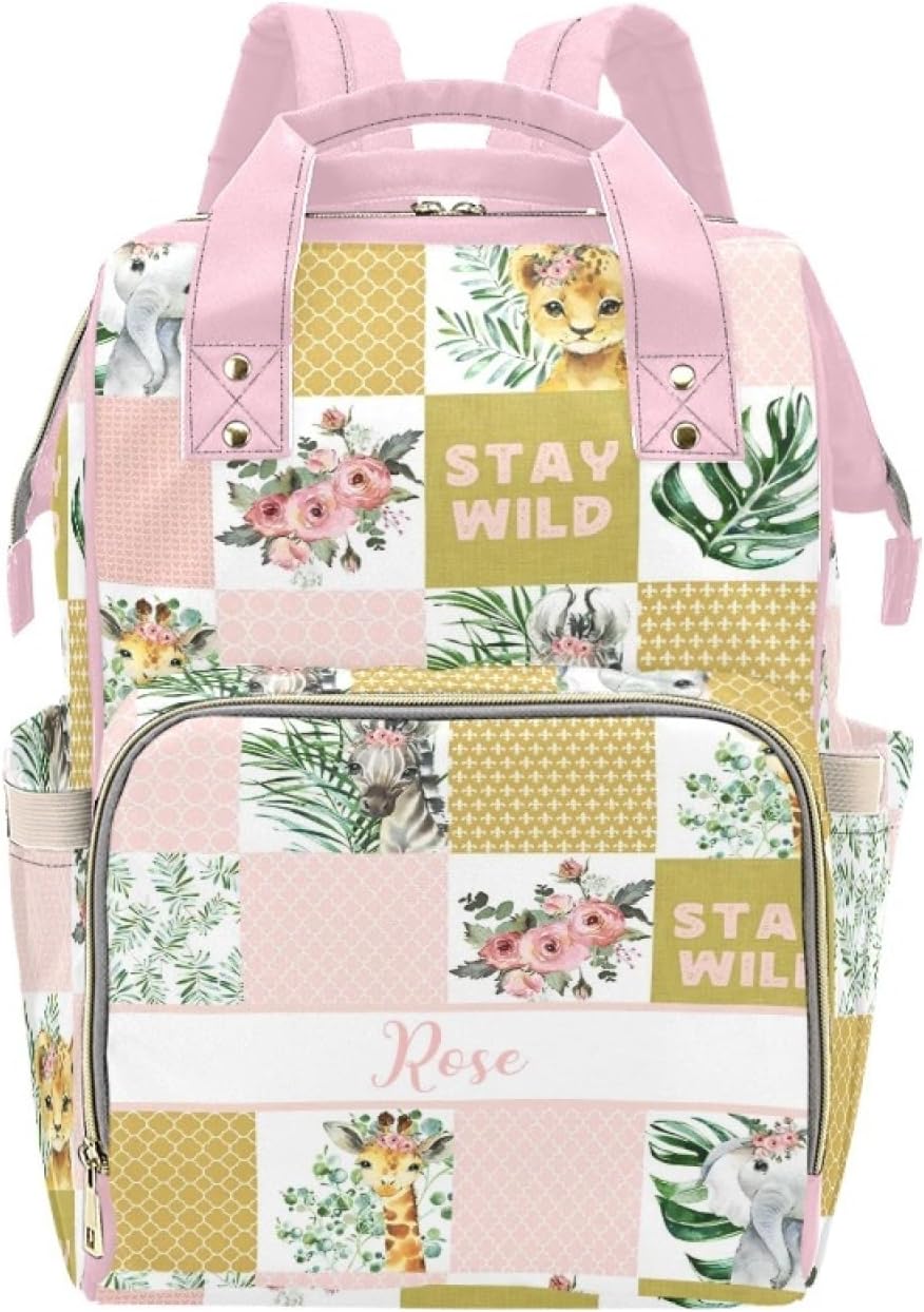 Personalized Name Diaper Bag – Stylish and Functional for Moms and DadsMaterial: Made from waterproof nylon to withstand everyday use.Size: Measures approximately 10.83"(L) x 6.69"(W) x 15"(H) x 3.1"Design & Structure:Features a large main compartment, 2 side pockets, 1 front zippered pocket, and multiple smaller pockets for easy organization.Includes a side zipper for quick access and a designated bottle section for added convenience.Thoughtfully designed to make packing and unpacking hassle-free. A mesh pocket featured. Padded back and adjustable shoulder straps for ultra comfort and stability. Multi function backpacks are suitable for many occasions. Zipper closure allows it easy to open and close.Multi-function Design: Front compartment includes 3 insulated pockets and one mesh compartment, the milk bottles can be placed in the insulated pockets. The other big compartment inside designed by absolute 4 pockets and one zipper pocket, so that you could put different things and keep them organized. m&m diaper bag also with 2 side pockets.Custom baby bag backpack for your daughter, granddaughter, friend as baby shower gift, birthday gift, mother's day gift. This diaper bag can be easily carried on your wrist, shoulder bag or hang on the stroller. Can act as both a diaper bag or regular backpack, and it is great gift for newborn parent and shower gift. It is best option birthday, mother's day gift.Easy Customization: 1. Select your preferred style. 2. Click "Customize Now." 3. Add the name you'd like to feature.