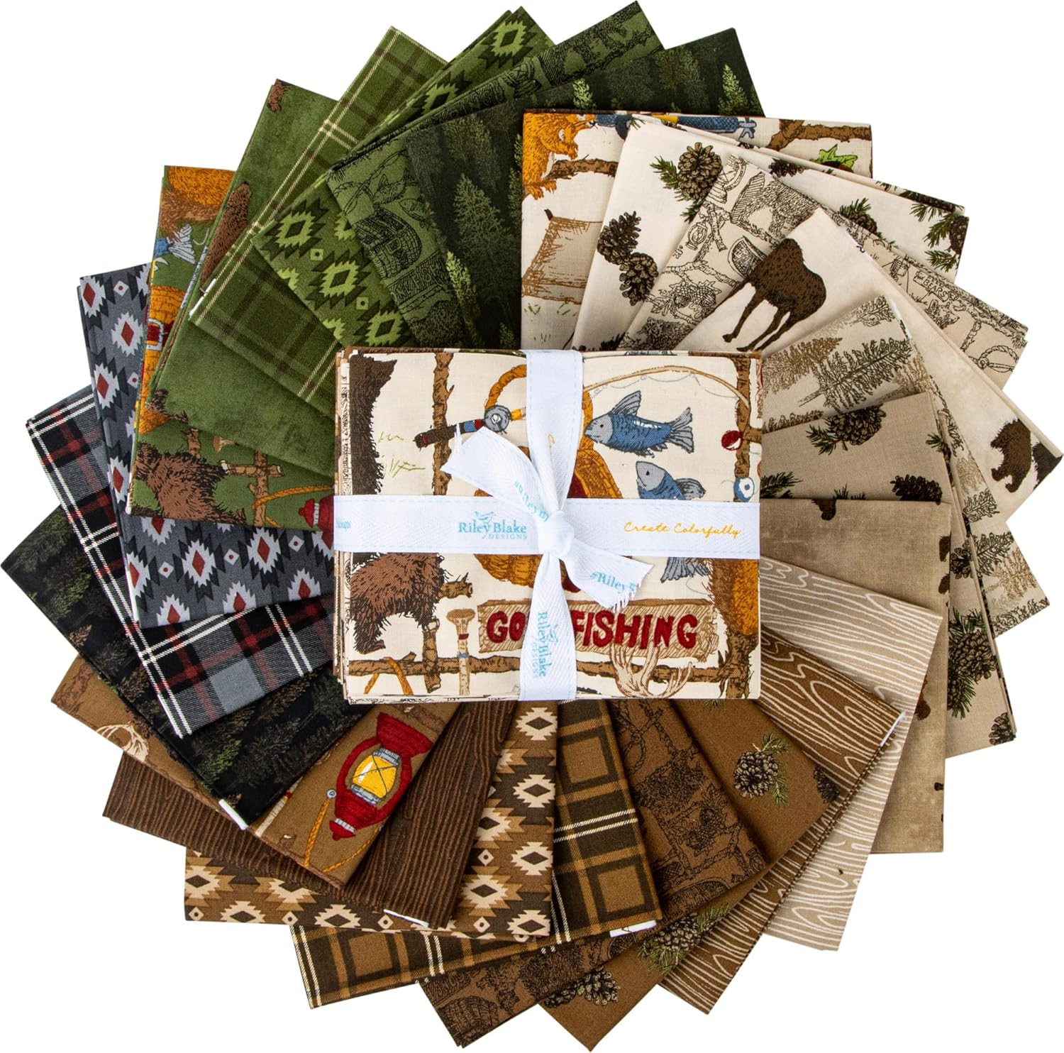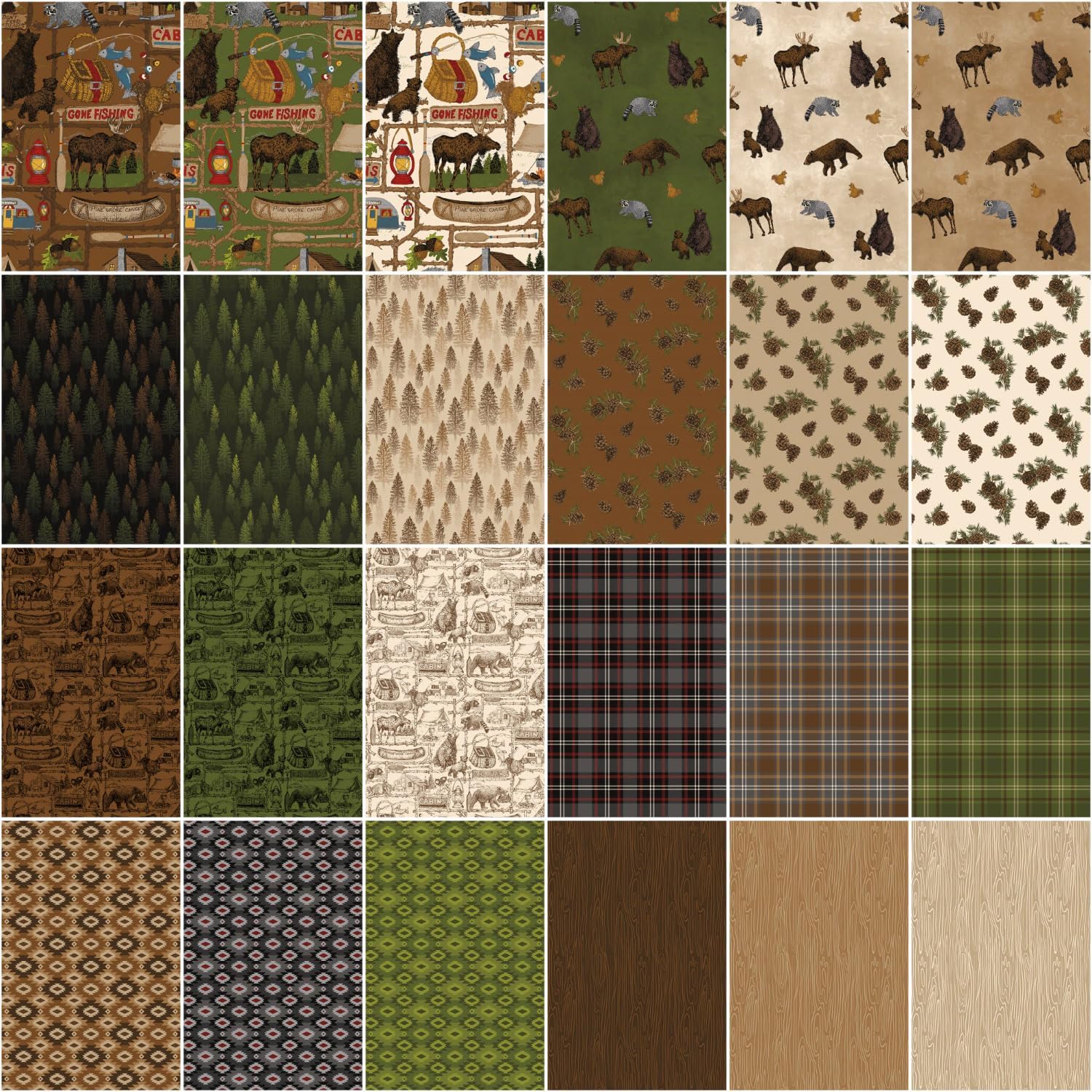 Fabric bundle of 24 18-inch by 22-inch fat quarters from the Pine Grove collection by designer RBD Designers for Riley Blake Designs. Happy campers abound with Pine Grove from the RBD Designers! The main print is filled with postcard moments of wildlife, canoes, cabins, tents, glampers and other camping themed things. The coordinating prints of wildlife, trees, pinecones, plaids and more will have you hankering for the great outdoors! The woodsy palette of brown, putty, black, green and tan will naturally have you creating all kinds of projects for at home and on the road. The Great Outdoors are calling, and we want s'more!
