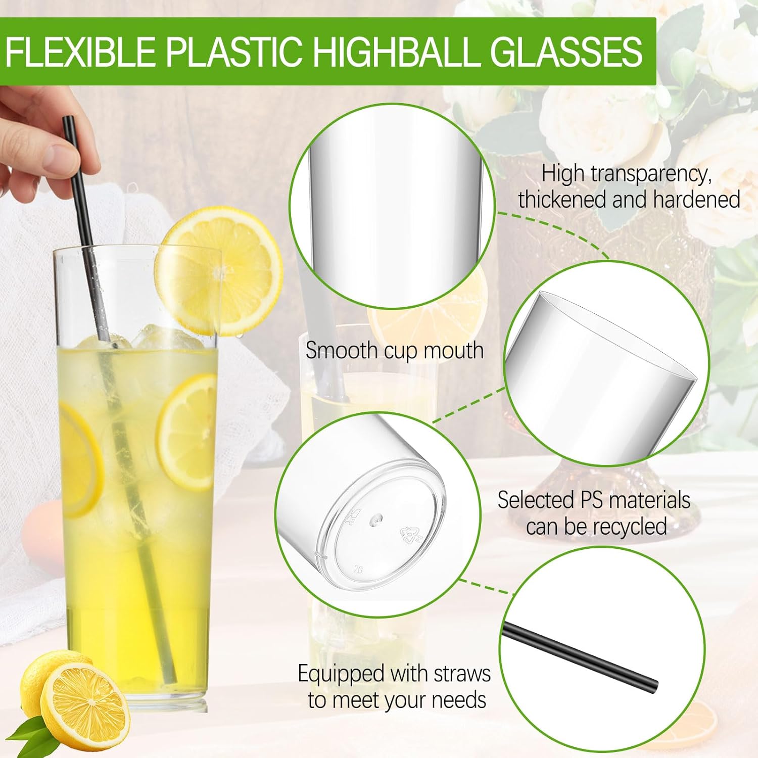 | Included Components | 48 x Disposable plastic highball glasses, 48 x Big black straws |
