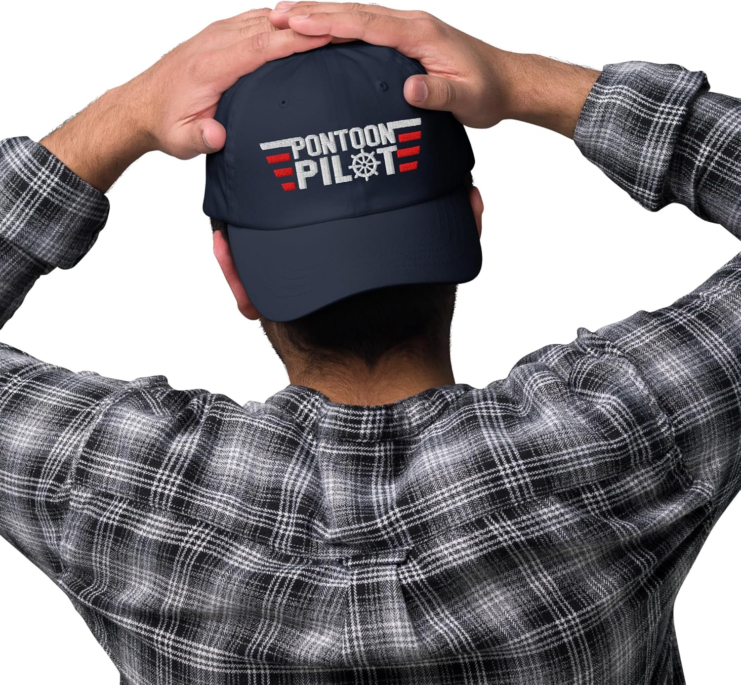 A stylish, low-profile dad hat that was created for the pontoon boat captain who loves pontooning and cruising the lake, river or waterways. Features a patriotic, movie-themed red, white and blue embroidered pontoon pilot design. A funny pontoon boat hat or gift for dad, grandpa, brother, uncle or anyone who enjoys pontoon boating. Low-profile, unstructured 6-panel pontoon boat hat100% chino cotton twill3 ⅛” crownAdjustable strap with antique buckleHead circumference: 20 ½” - 23 ⅝”Type: boating hat, dad cap, baseball hatEmbroidered in the USAGoTime Apparel