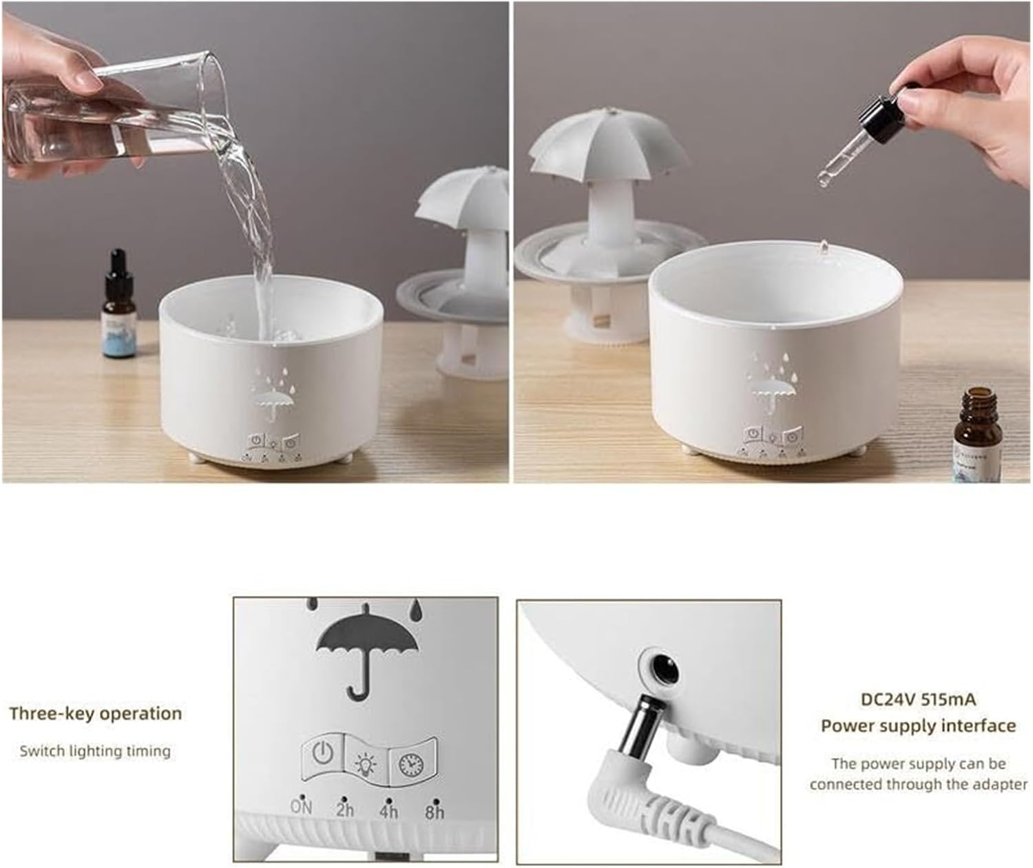 This portable humidifier features a unique and stylish umbrella design, making it a addition to any home or office. The compact and lightweight build allows for easy placement on desks, nightstands, or shelves. With its built in aromatherapy function, you can enhance your space by adding a few drops of your preferred essential oils, creating a calming and refreshing environment.The included remote control offers convenient operation, allowing you to adjust mist levels and settings without leaving your seat. Designed for ultra quiet performance, this humidifier operates silently, making it ideal for use during work, sleep, or relaxation. The large water tank ensures extended operation without frequent refills, while the auto shut off feature provides peace of mind by turning the unit off when the water level is low.Whether you need to add moisture to dry air or enjoy the benefits of aromatherapy, this humidifier is a practical and elegant solution. Its modern design blends seamlessly with any decor, offering both functionality and style.