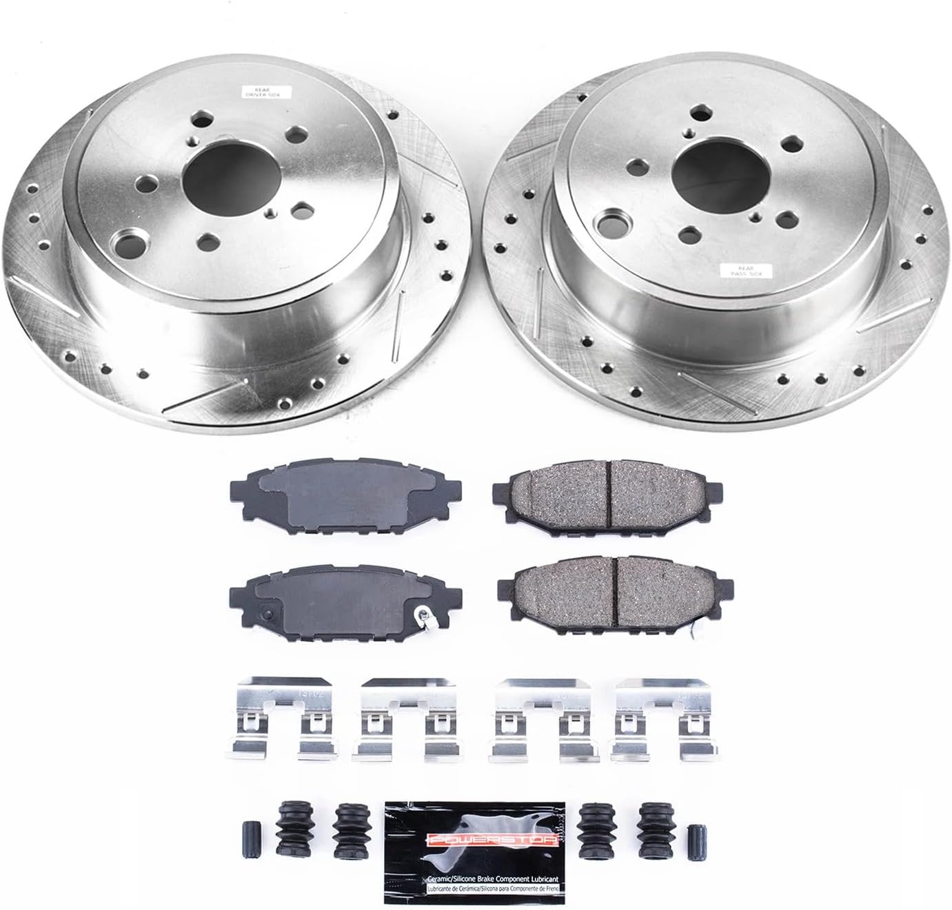 Product: PowerStop Z23 Evolution Sport Brake Pads and Drilled & Slotted Rotor KitWhat’s in the Box: This premium Z23 brake kit upgrade includes Z23 Carbon-Fiber Ceramic Brake Pads, Drilled & Slotted Rotors, Rubberized Shims, and Installation HardwareEngineered For:Long Lasting Performance Seekers - Significant performance improvements above OE brakes with a 3 year / 36,000 mile warranty to back it upThe Enthusiast - Your do it all option to keep you braking quiet and dust free without sacrificing stopping power and temperature control in high demand situationsBolt on ready - This kit includes premium stainless steel hardware for an easy install. No modifications needed to your vehicleComponent Breakdown:The Pads (Z23 Formula) - The included Z23 pads use a low-dust ceramic formula reinforced with carbon fibers. This provides severe-duty stopping power without sacrificing everyday drivability or creating noiseThe Rotors - Zinc plated to protect against rust. The precision drilled holes and rounded slots maximize cooling and wipe away gas/debris—critical for keeping temperatures down during all operating conditionsThe Hardware - High-quality stainless steel installation hardware makes an easy install even easierInstallation: A true bolt-on upgrade. No modifications required. Includes all necessary stainless-steel hardware for a hassle-free installThis Item Fits:Rear: 2013-16 Subaru BRZ with Solid Rear Rotors Rear: 2009-13 Subaru Forester Rear: 2008 Subaru Impreza 2.5i; Rear Disc Rear: 2008-11 Subaru Impreza Outback Sport Rear: 2008-14 Subaru Impreza WRX Rear: 2009-10 Subaru Impreza 2.5 GT Rear: 2009-11 Subaru Impreza 2.5i Rear: 2009-14 Subaru Impreza WRX Premium Rear: 2010-11 Subaru Impreza 2.5i Premium Rear: 2010-14 Subaru Impreza WRX Limited Rear: 2014 Subaru Legacy 2.5i Sport Rear: 2010-14 Subaru Legacy 2.5i Rear: 2010-14 Subaru Legacy 2.5i Limited Rear: 2010-14 Subaru Legacy 2.5i Premium Rear: 2010-14 Subaru Outback 2.5i Rear: 2010-14 Subaru Outback 2.5i Limited Rear: 2010-14 Subaru Outback 2.5i Premium